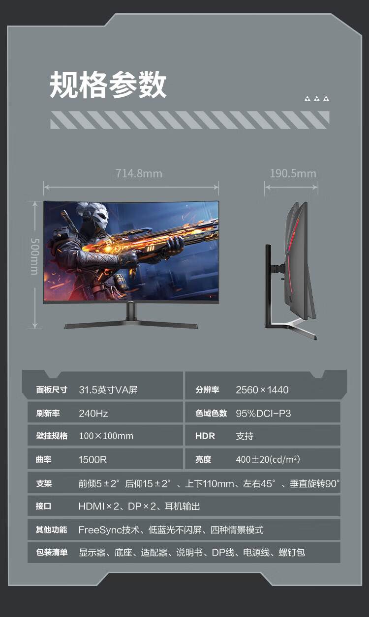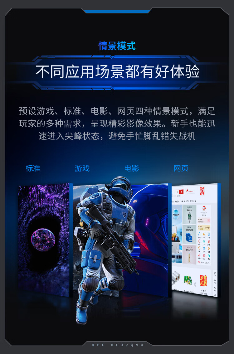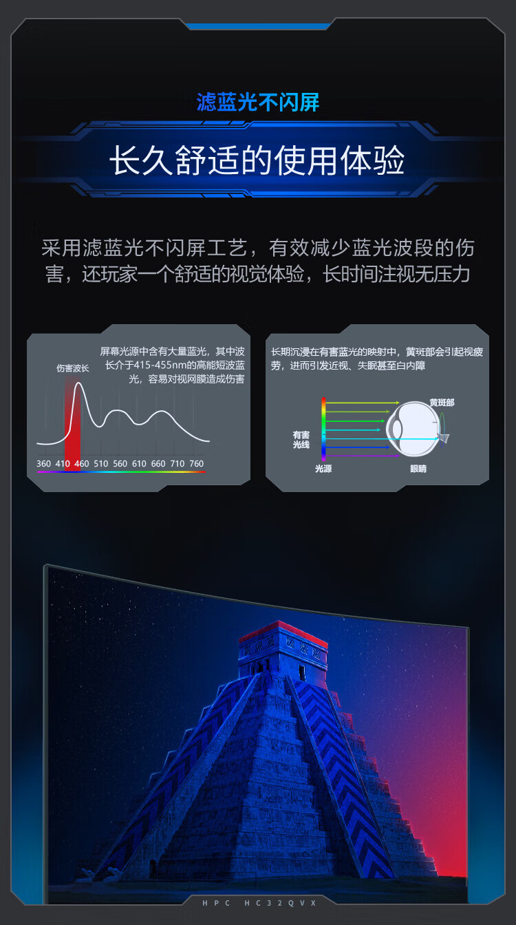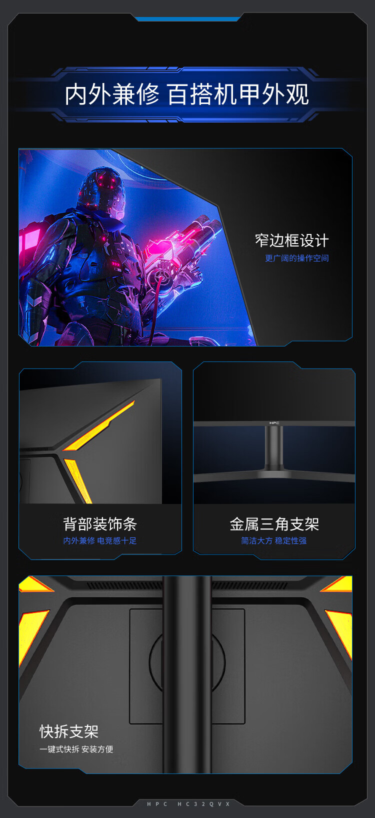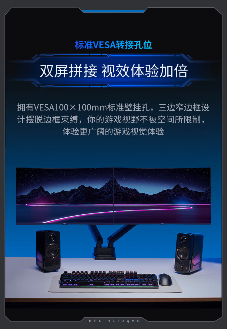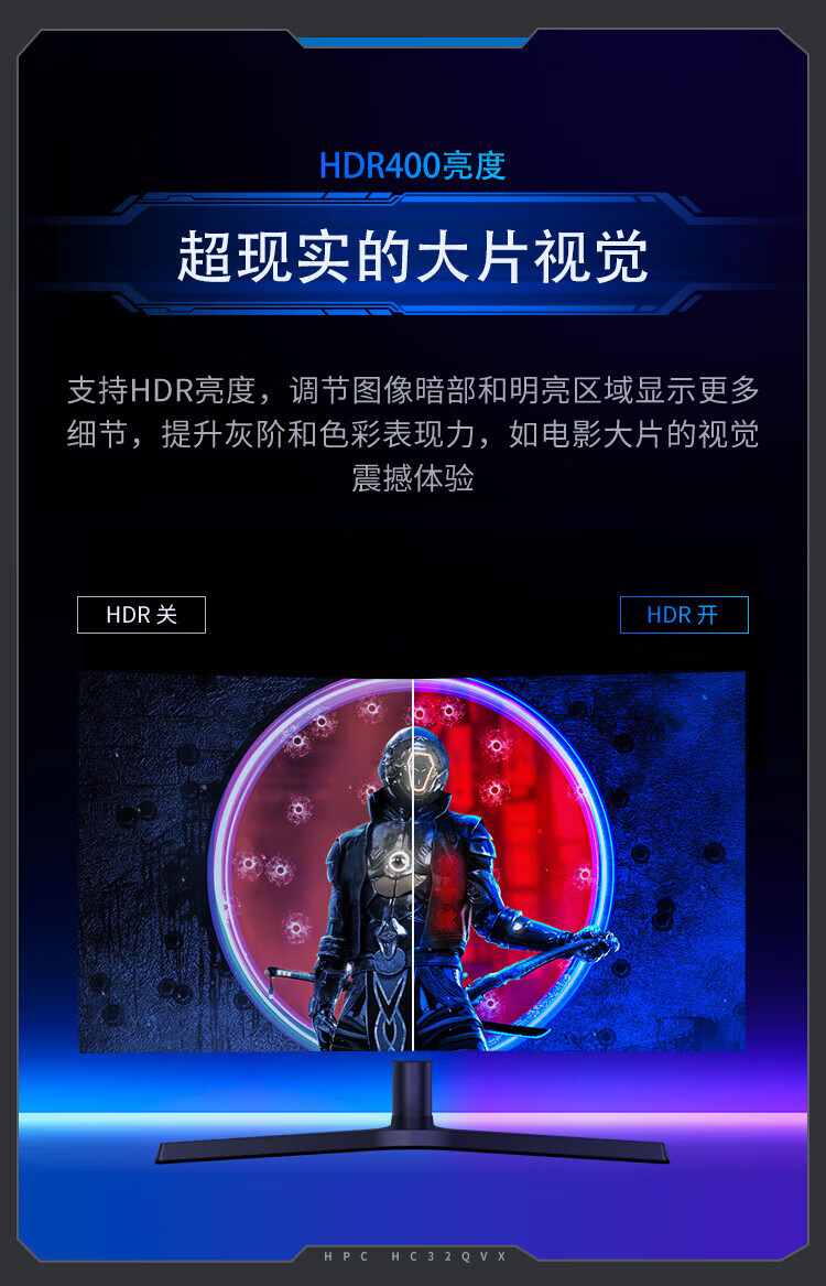 HPC 31.5英寸2K240Hz高刷电竞显示器 1500R曲面 HDR技术 滤蓝光 游戏电脑显示屏多功能支架 HC32QVX