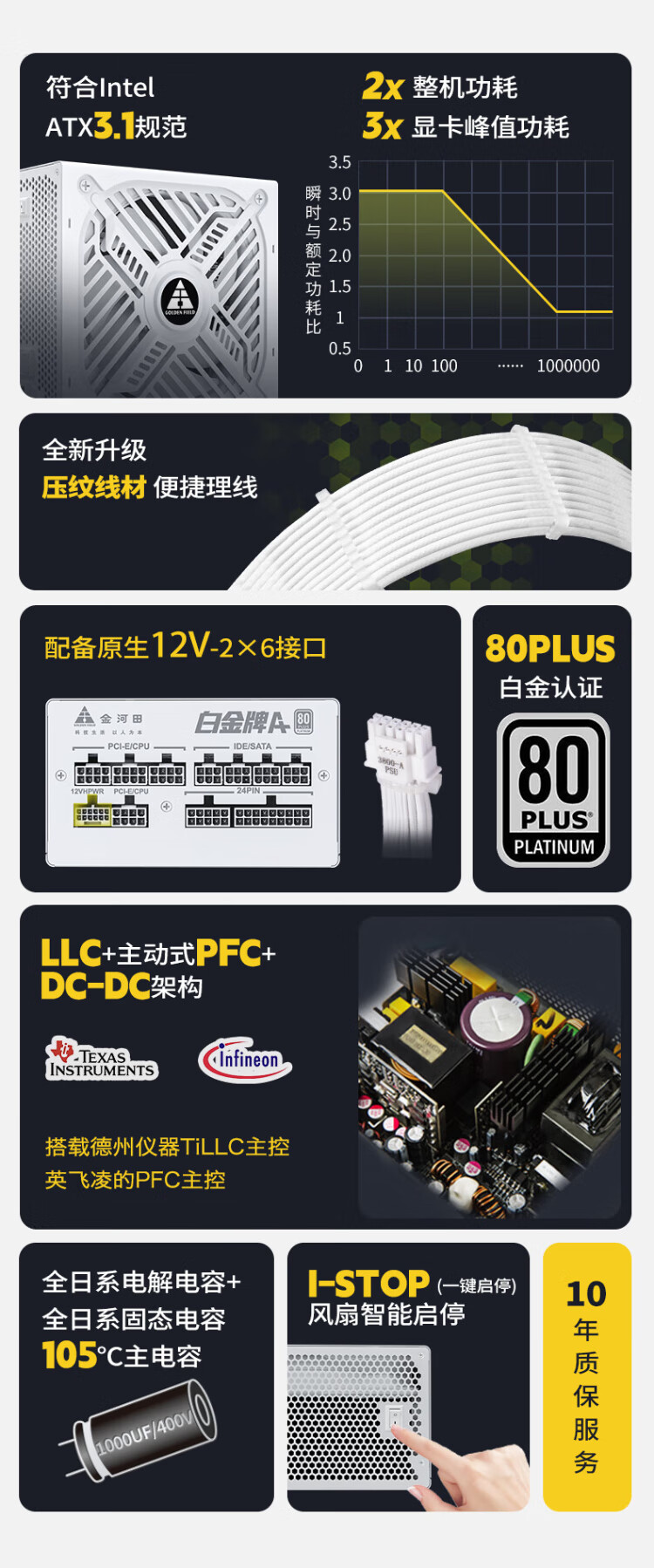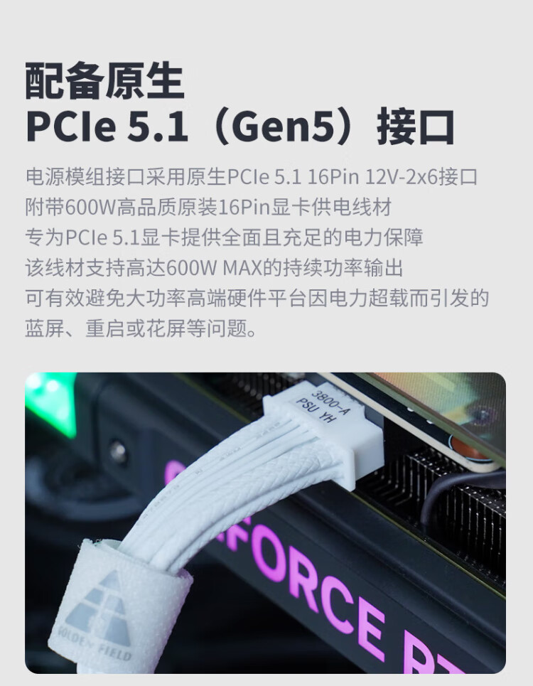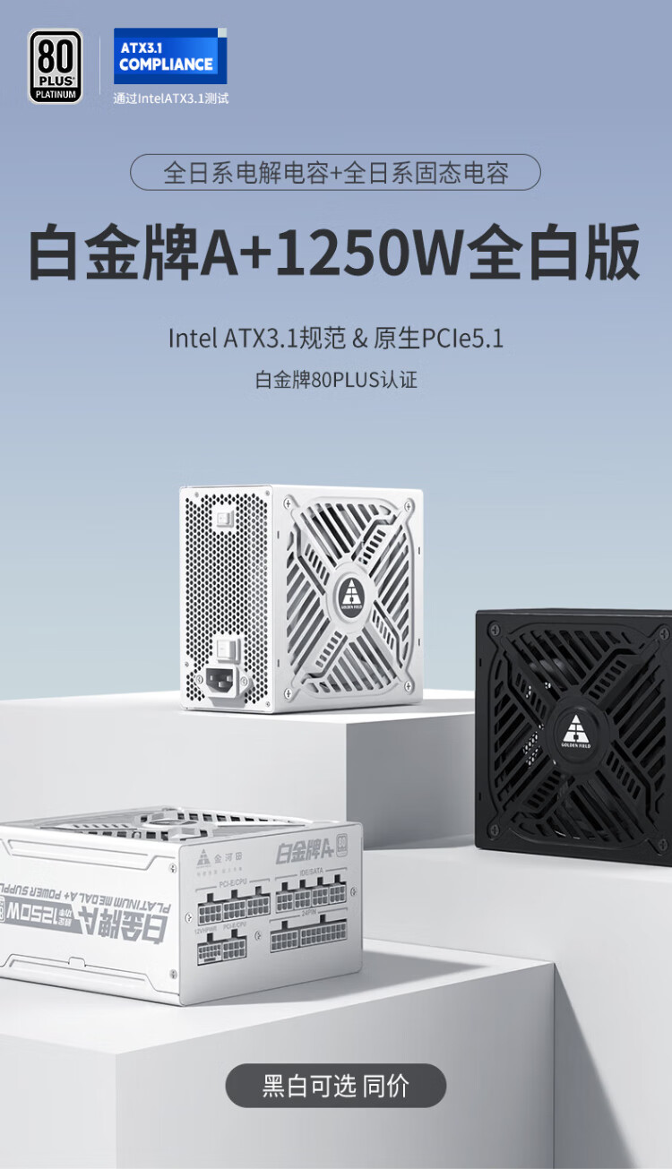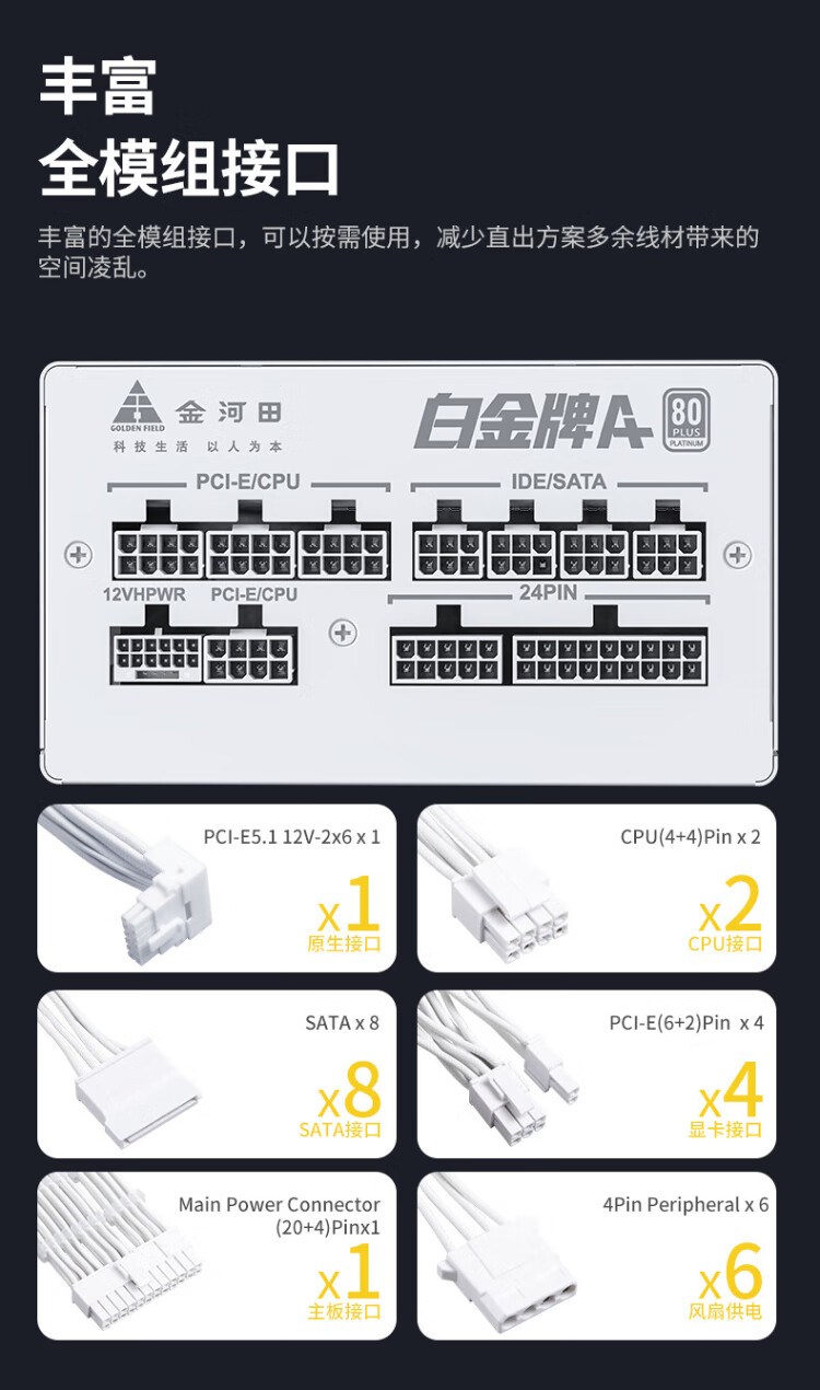 Golden Field Platinum A+1250W reinweiße Version des ATX3.1-Computer-Netzteils mit Platin-Zertifizierung/vollständiger japanischer Kondensator/12V2*6/10-Jahres-Ersatz/stabilisierte Spannung 5090/weich geprägter Draht
