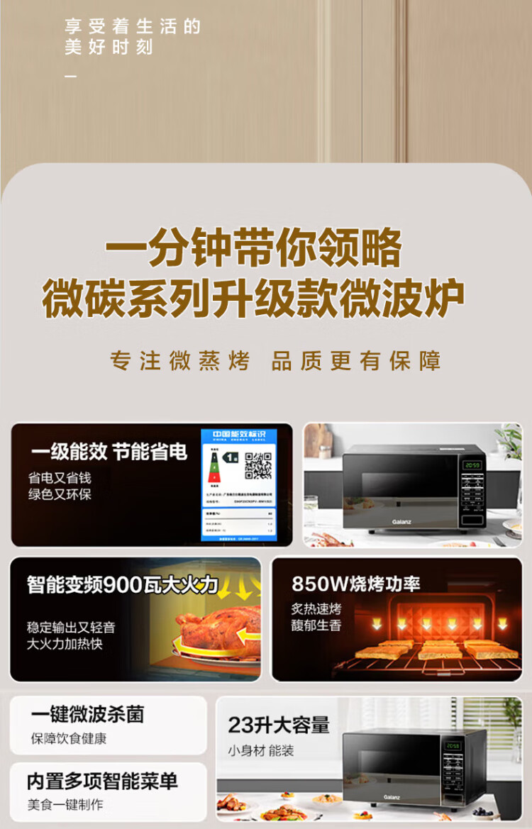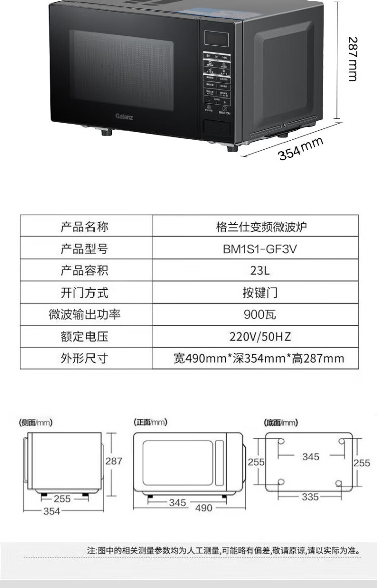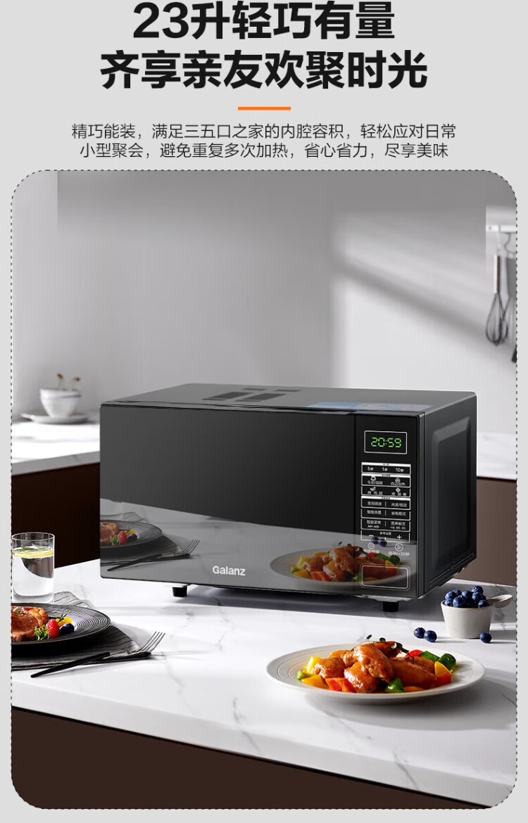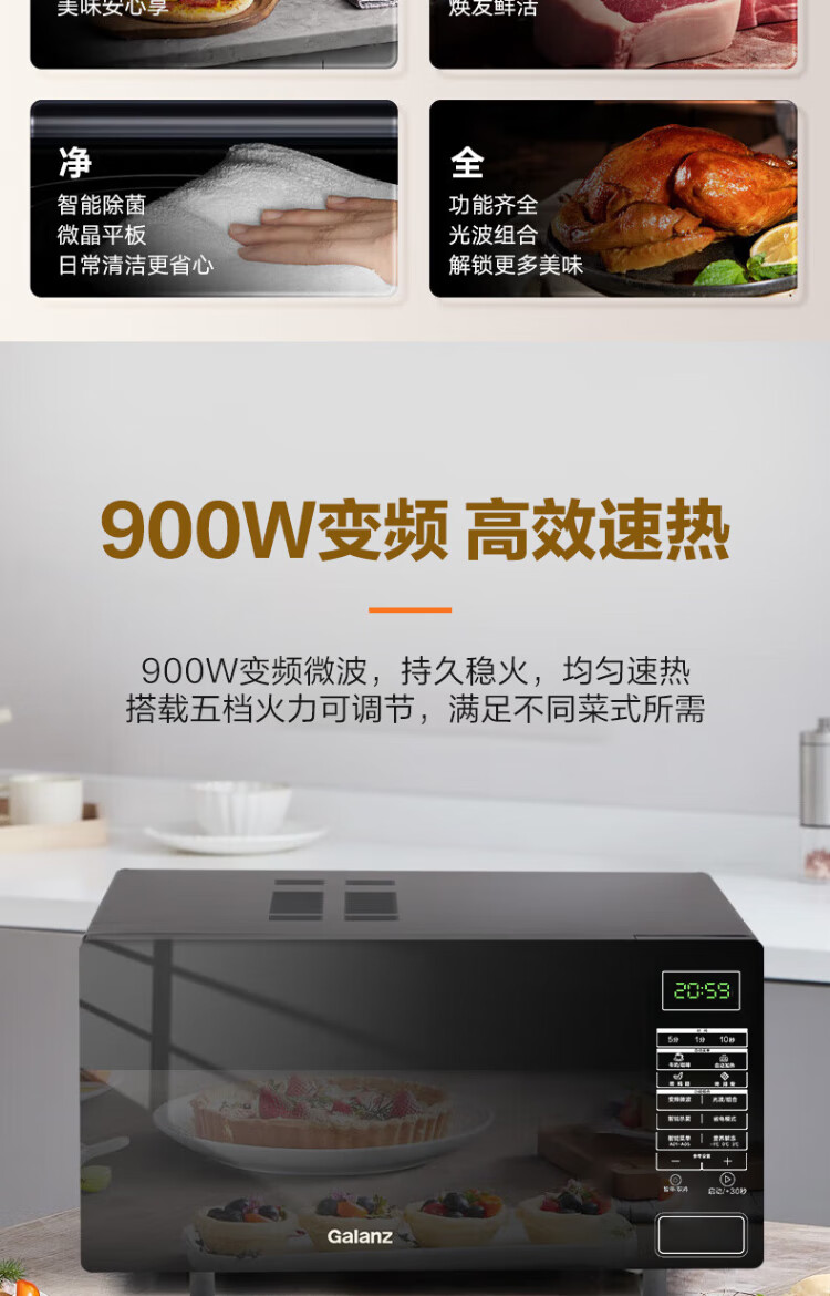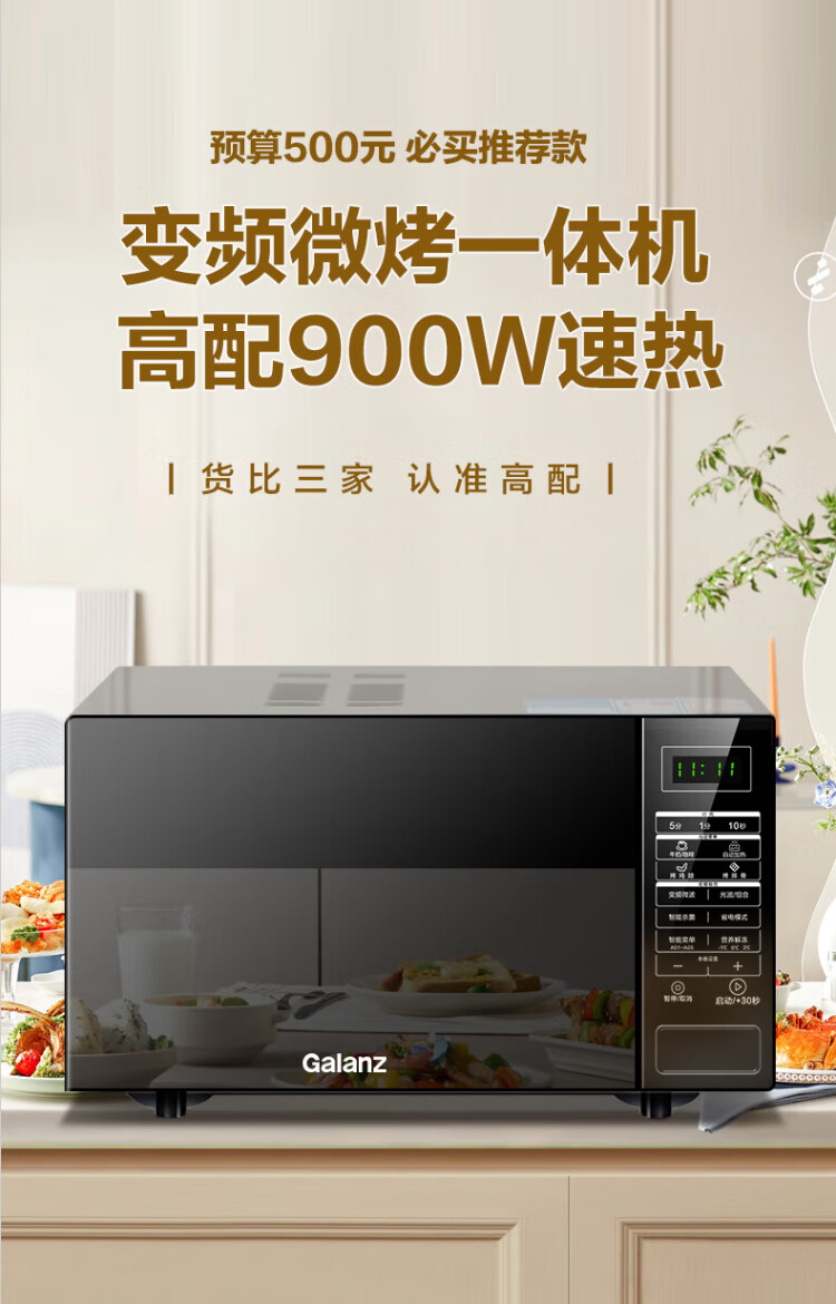 Galanz inverter microwave oven all-in-one machine 900 watts fast heating, energy saving, first-level energy efficiency, household 23 liter flat plate, easy to clean, can be grilled and defrosted BM1S1-GF3V