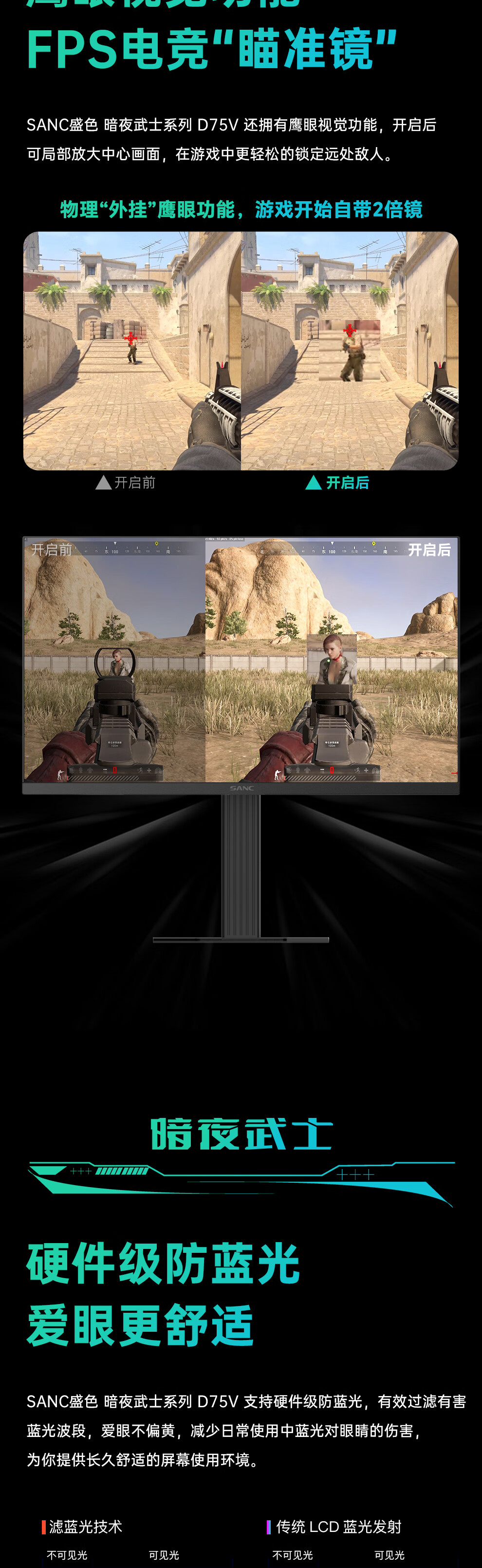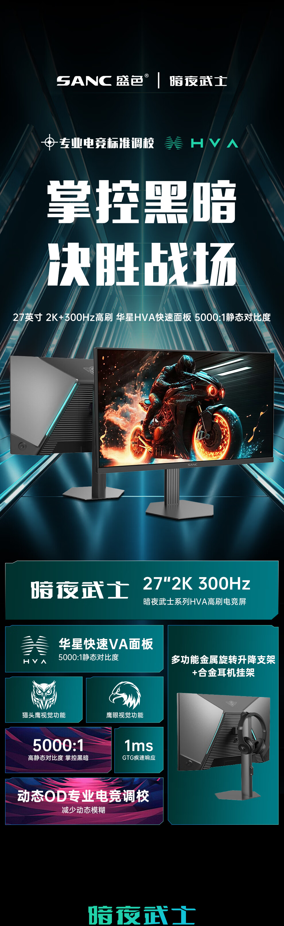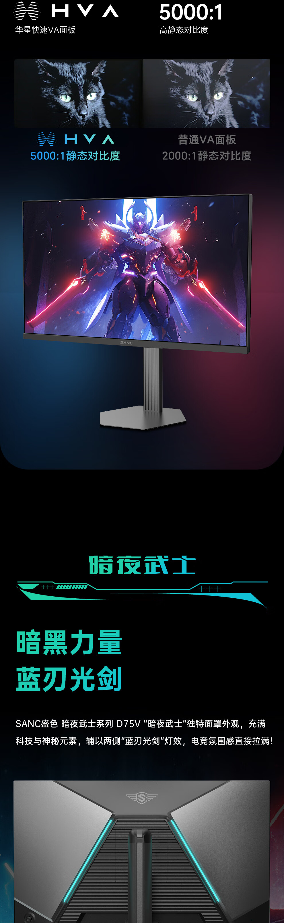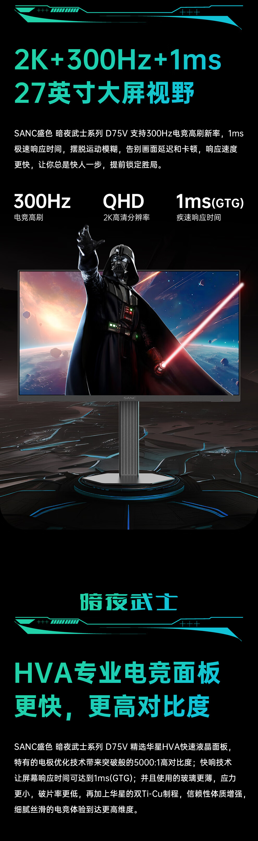 SANC盛色27英寸2K300Hz HVA快速液晶5000:1高对比度 硬件低蓝光 1ms旋转升降 电竞显示器屏幕 D75V