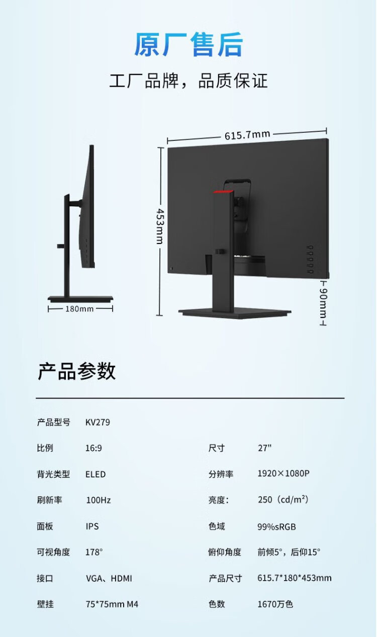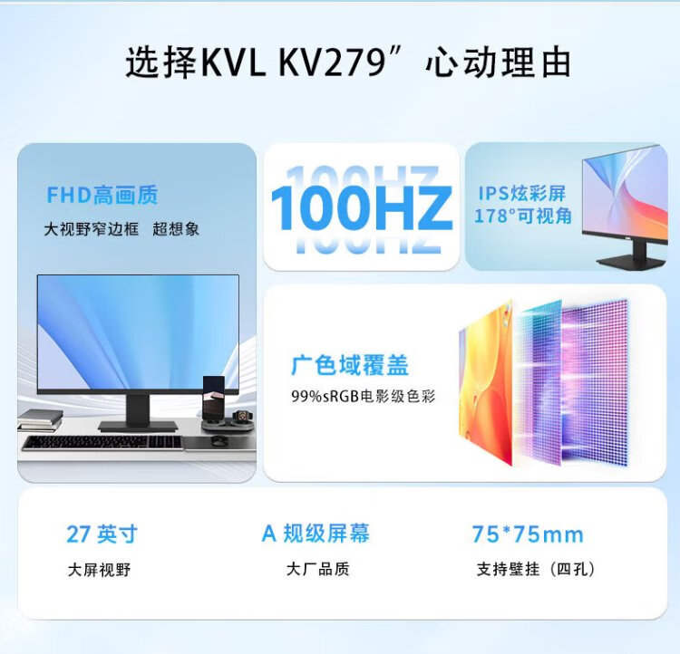 KVL 27英寸显示器 100Hz高刷新率 IPS技术 三微边设计 低蓝光爱眼 电脑办公显示屏 KV279
