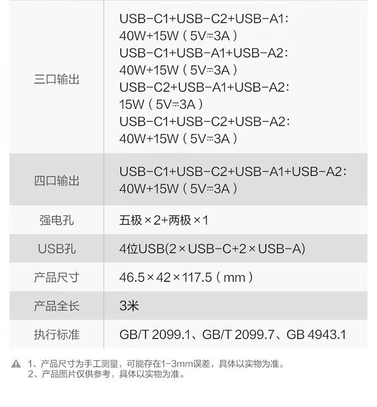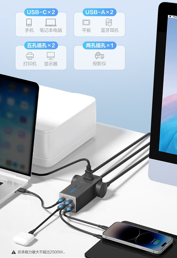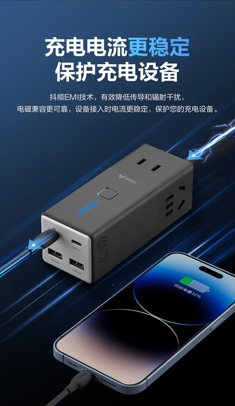公牛(BULL)氮化镓67W快充笔记本插座/USB插线板便携插排3C认证 适用iphone17  总控开关2C2A+3位全长3米灰色