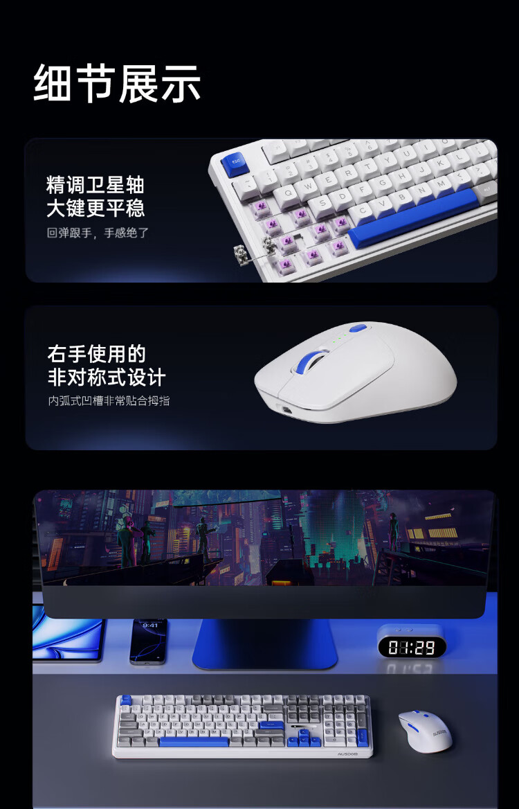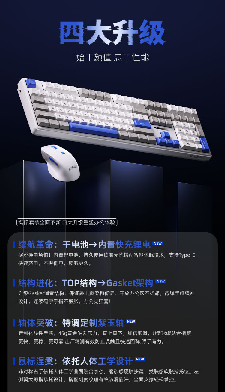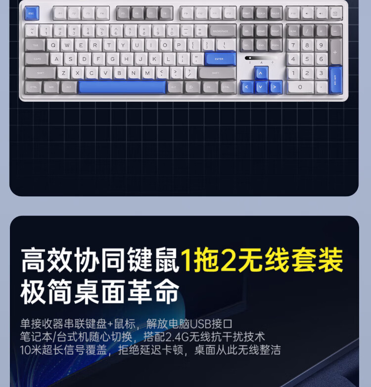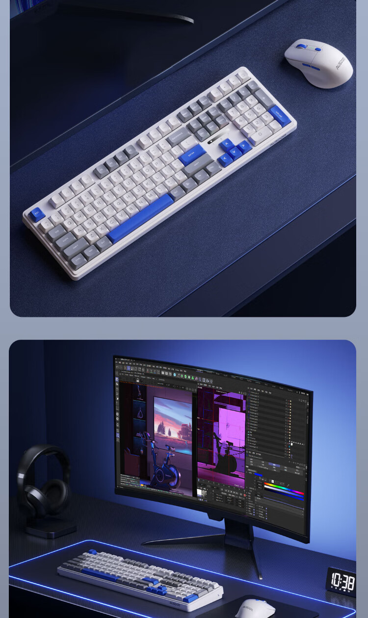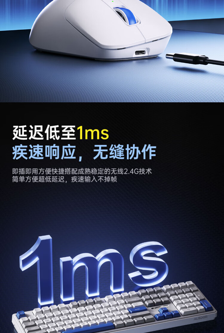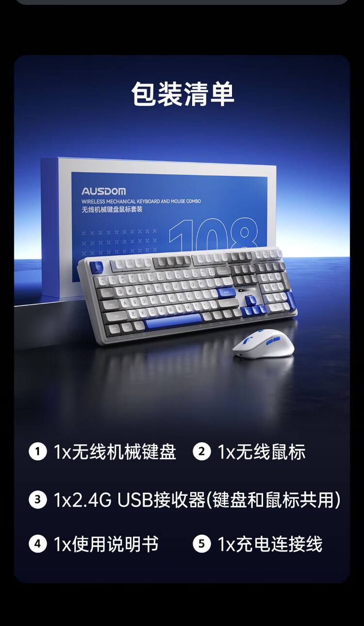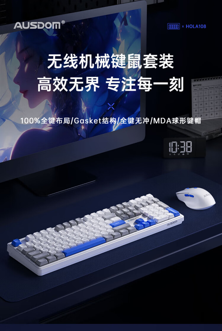 AUSDOM HOLA108 wireless keyboard and mouse set office gaming keyboard and mouse one-to-two 2.4G full-key collision-free desktop laptop computer high-looking mechanical keyboard set blue and white