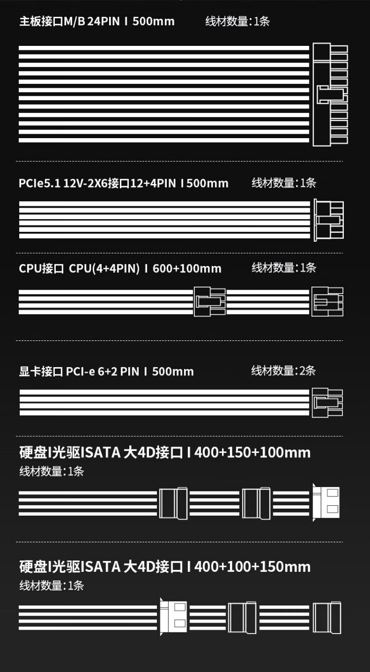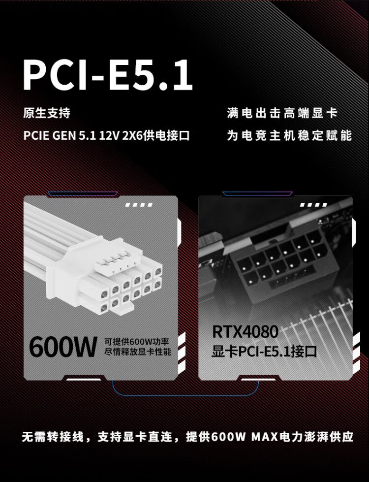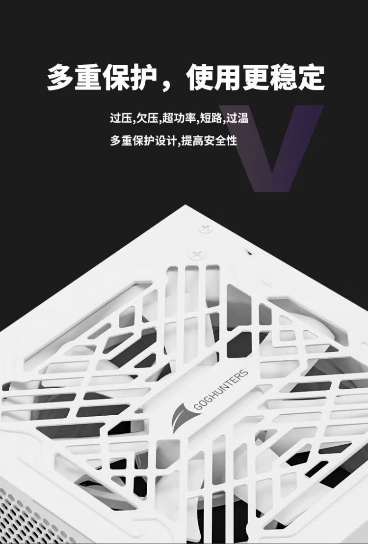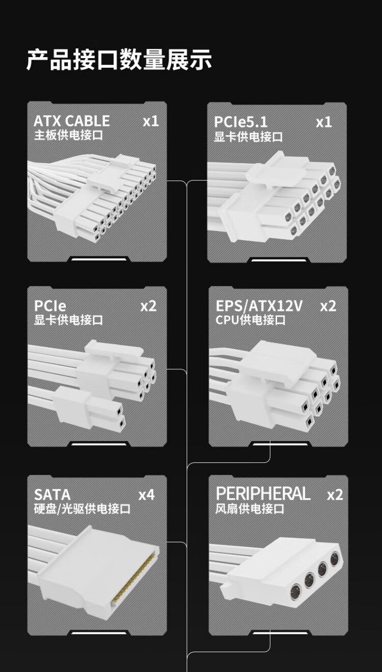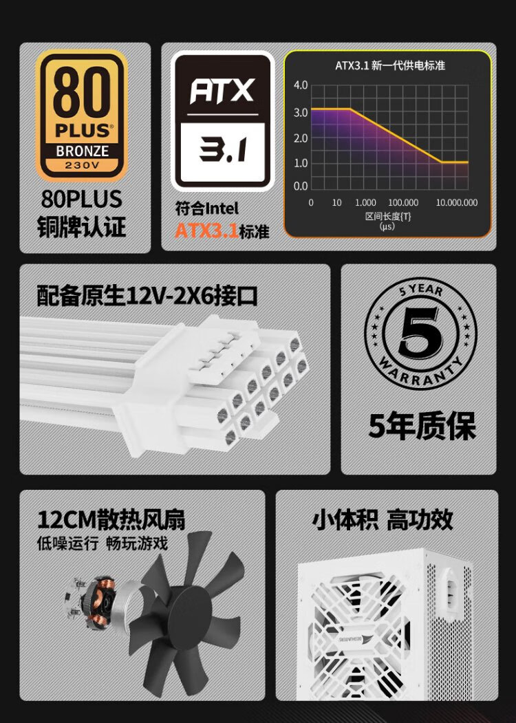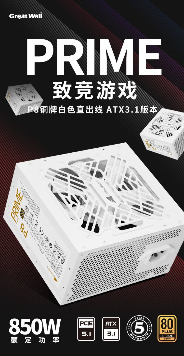 长城(Great Wall)额定850W P8白色铜牌直出线电源(ATX3.1/原生12V-2x6/单路12V/全电压/12CM风扇/支持5080显卡)