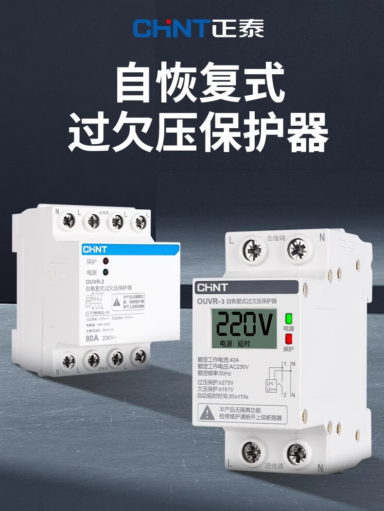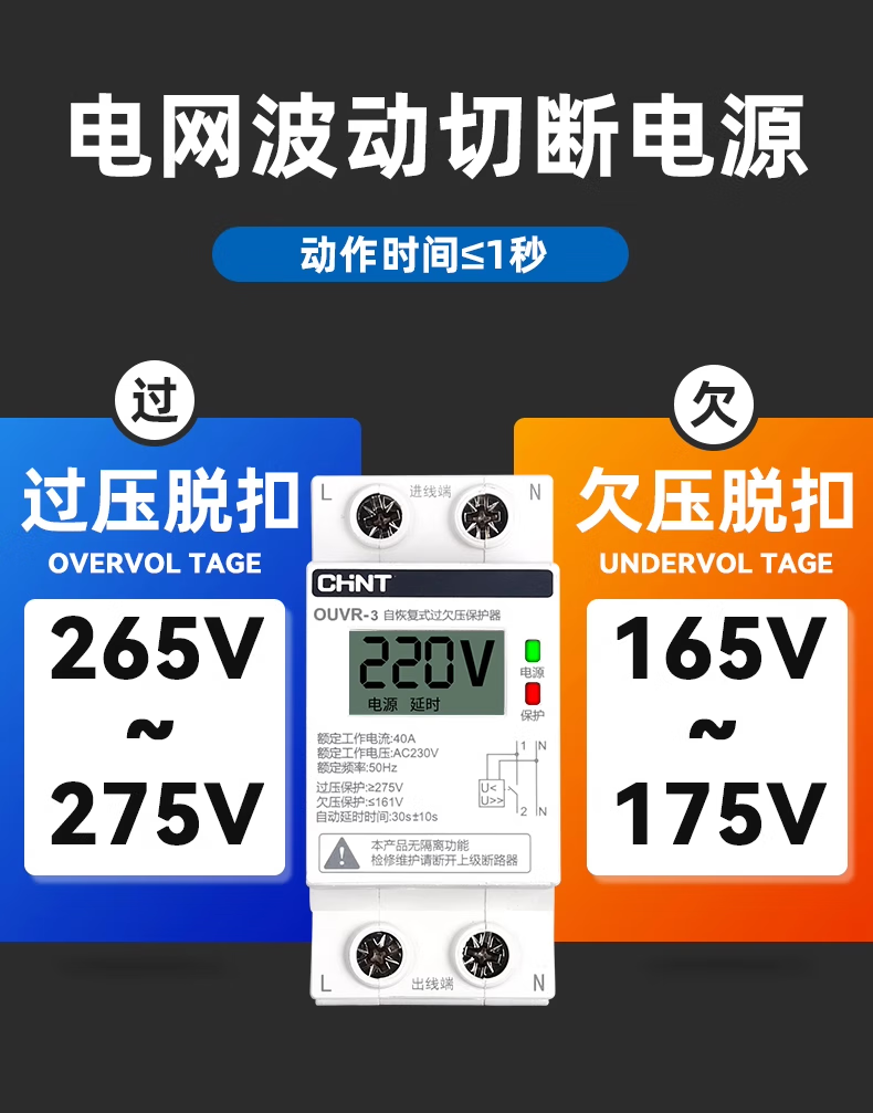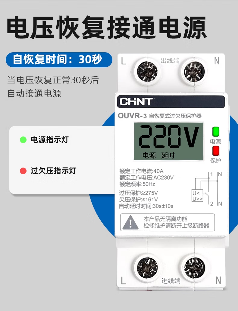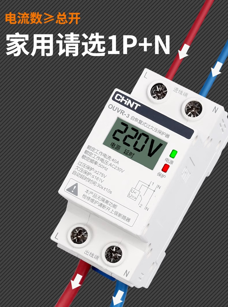 Chint Selbstwiederherstellender Über-Unterspannungs-Verzögerungsschutz OUVR-3 1P+N 40A Digitalanzeige Haushalt 220V automatischer Reset OUVR-3 1P+N 50A unten rein und oben raus