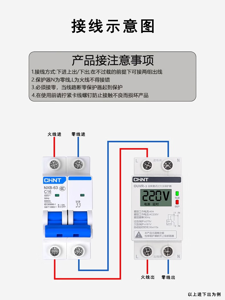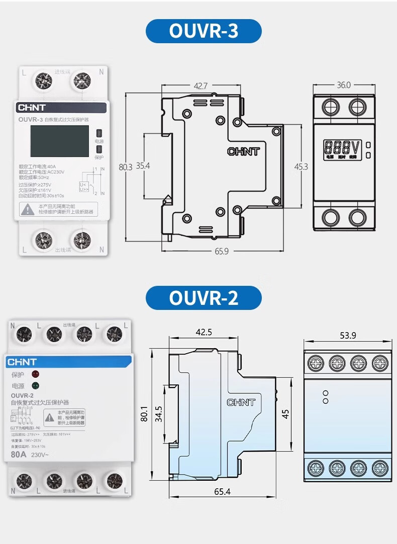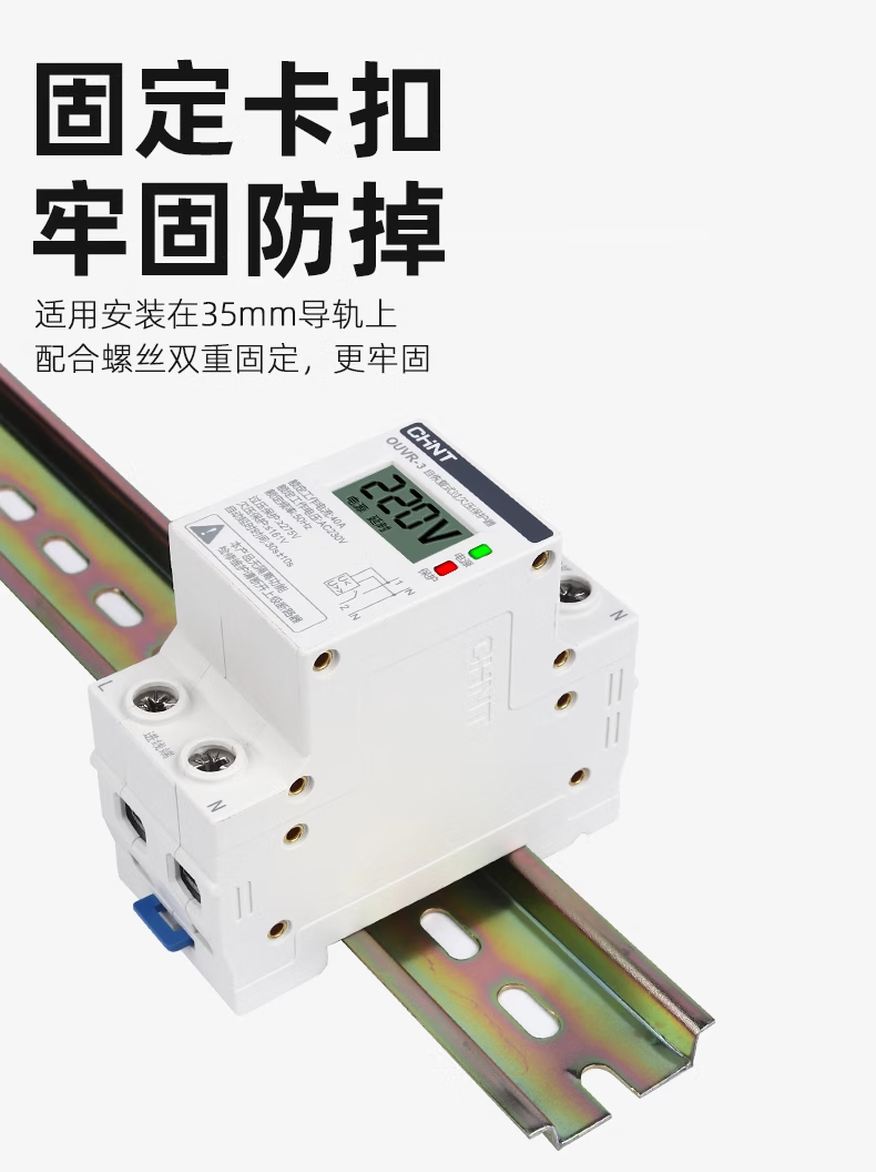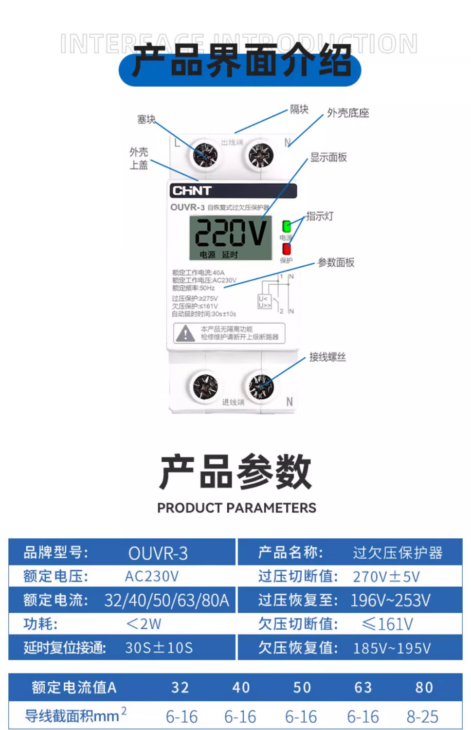 Chint Selbstwiederherstellender Über-Unterspannungs-Verzögerungsschutz OUVR-3 1P+N 40A Digitalanzeige Haushalt 220V automatischer Reset OUVR-3 1P+N 50A unten rein und oben raus
