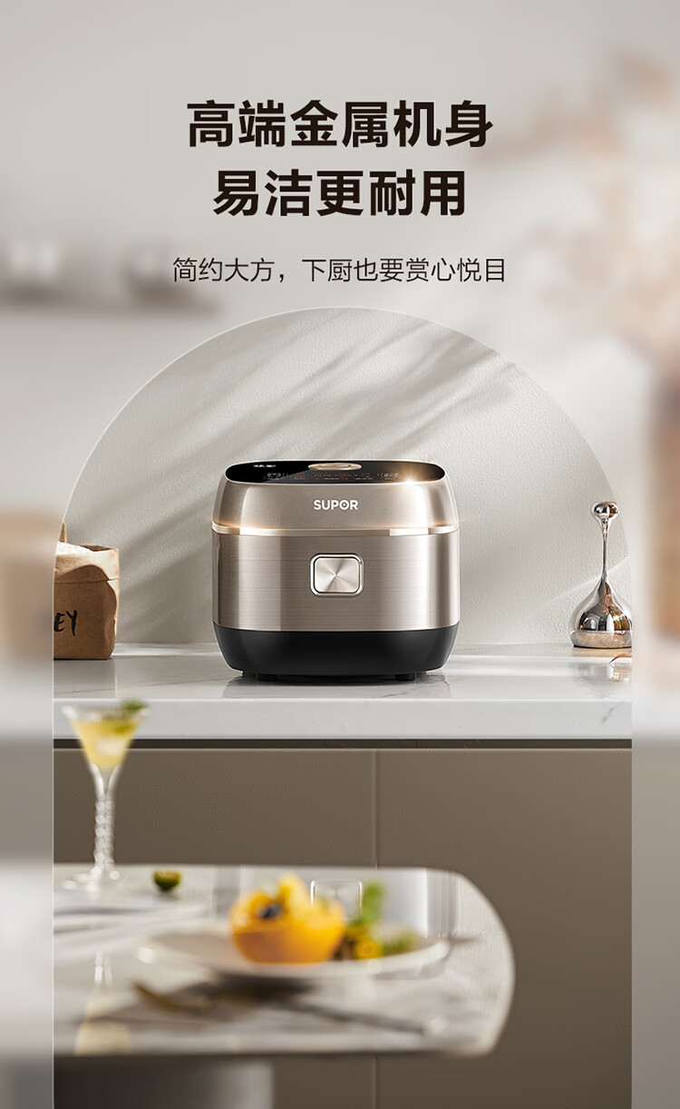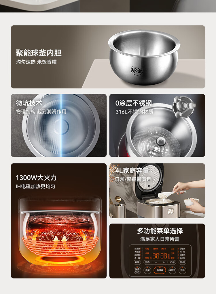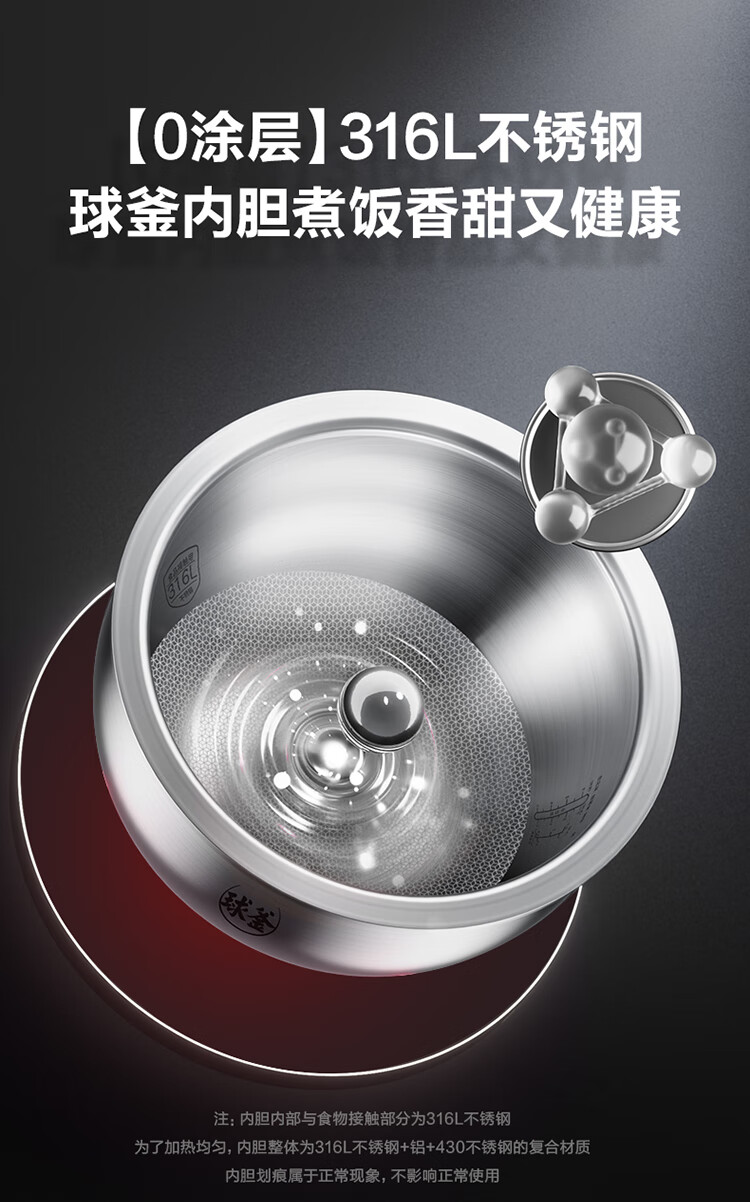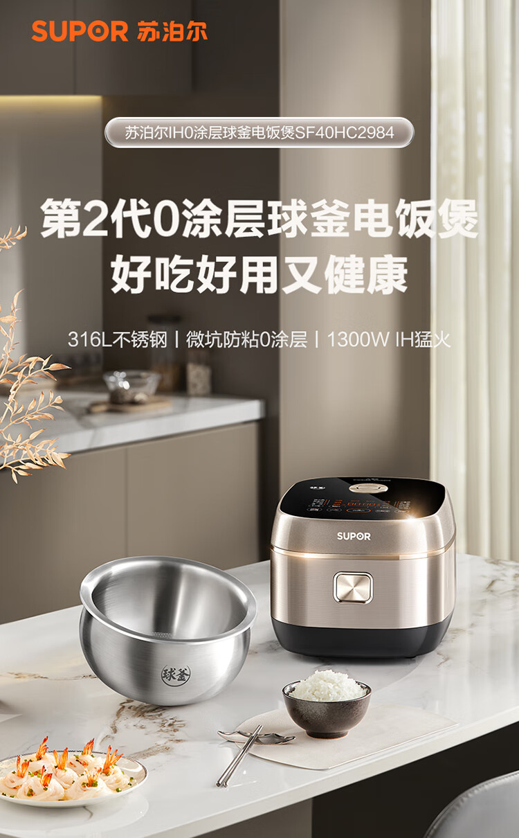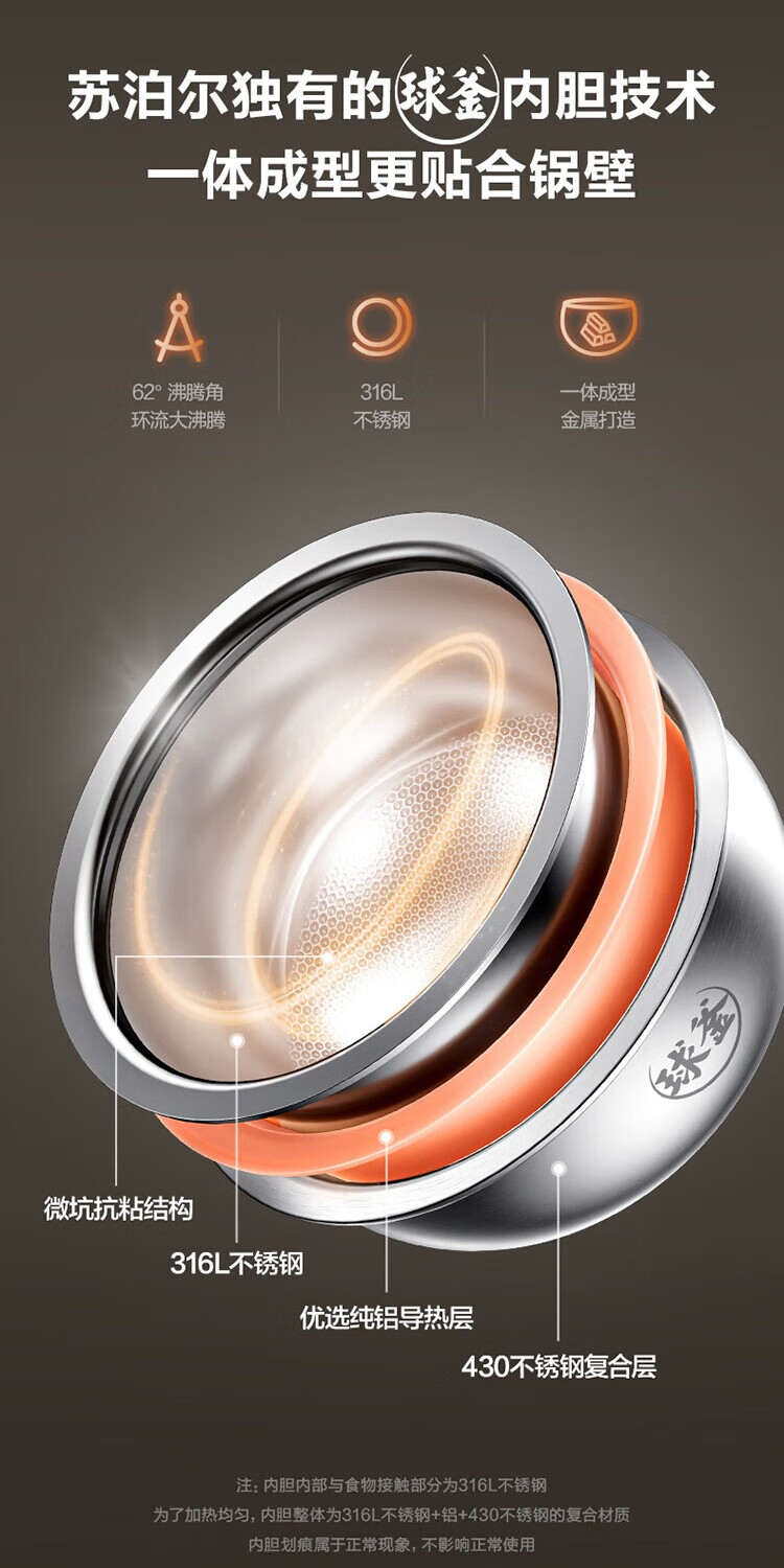 苏泊尔(SUPOR)官方推荐IH猛火电饭煲防粘0涂层4L高端电磁加热316L不锈钢球釜加厚内胆电饭锅家用智能多功能锅 微坑防粘0涂层 4L (可用4-8人)