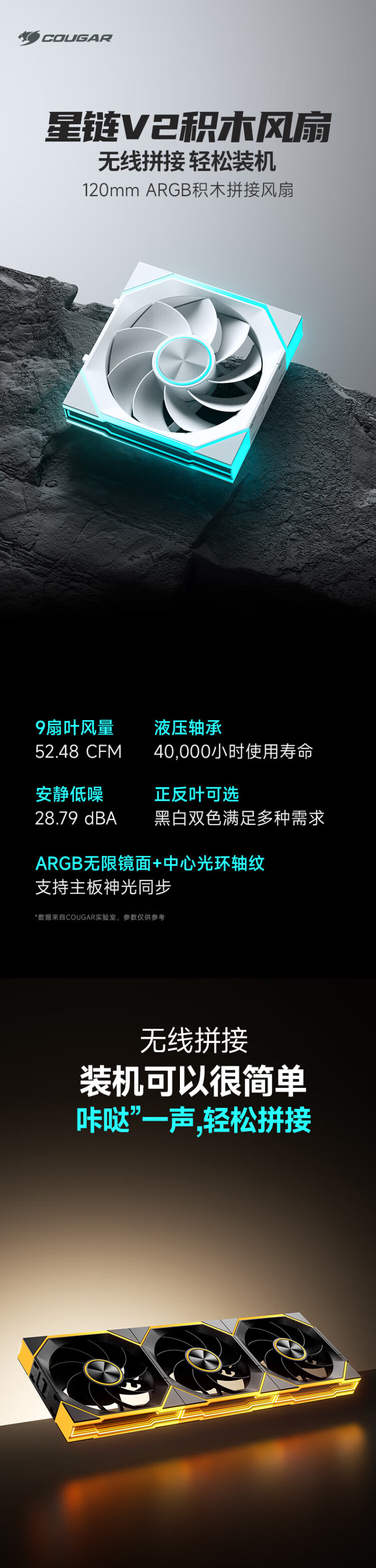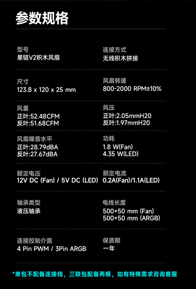 骨伽星链V2  机箱积木风扇 ARGB 5v3针主板同步 PWM温控调节(12CM/降噪防震脚垫) 星链V2黑色反叶(3连包)