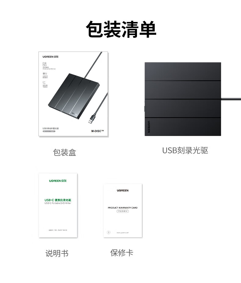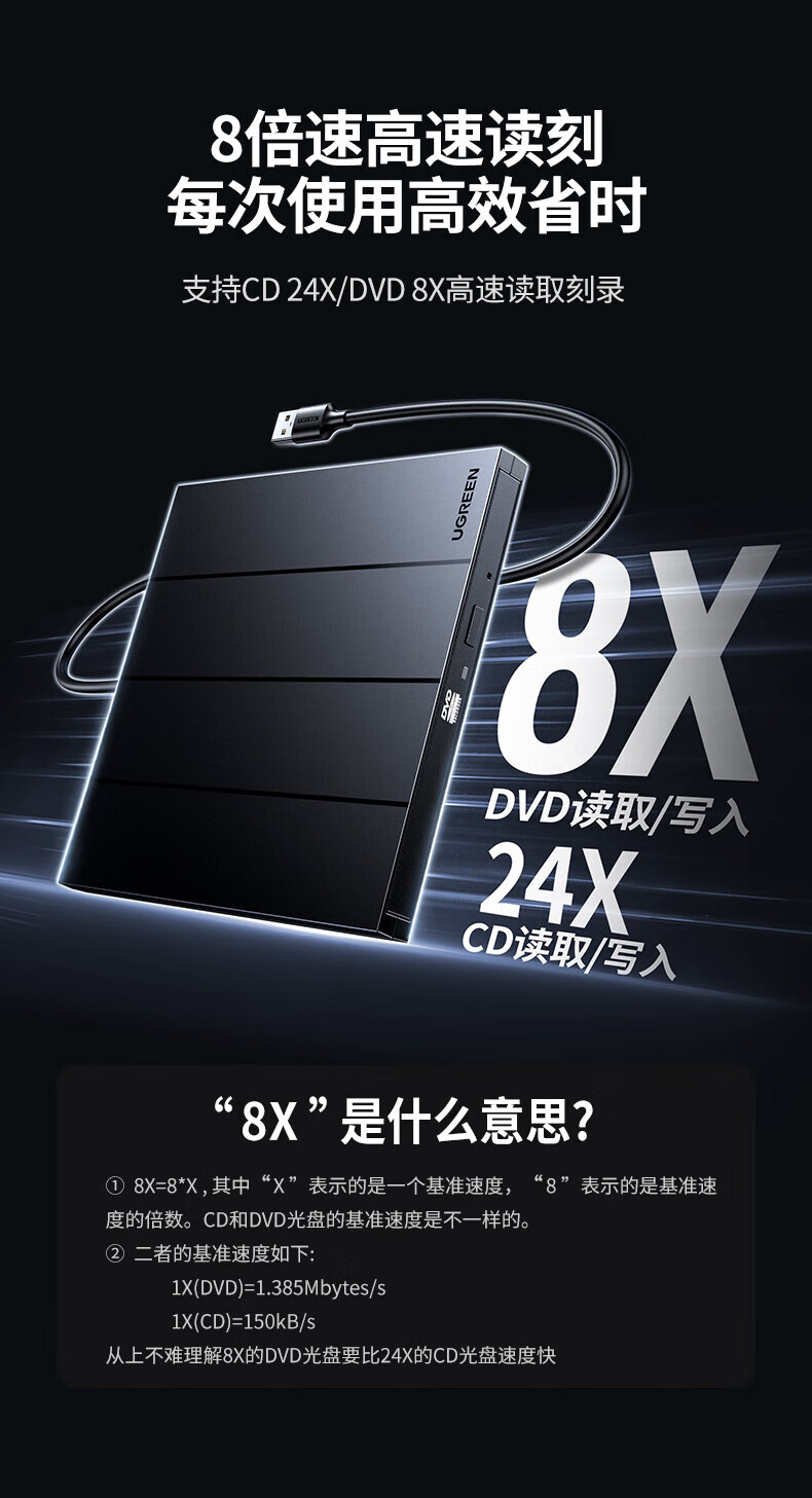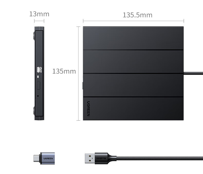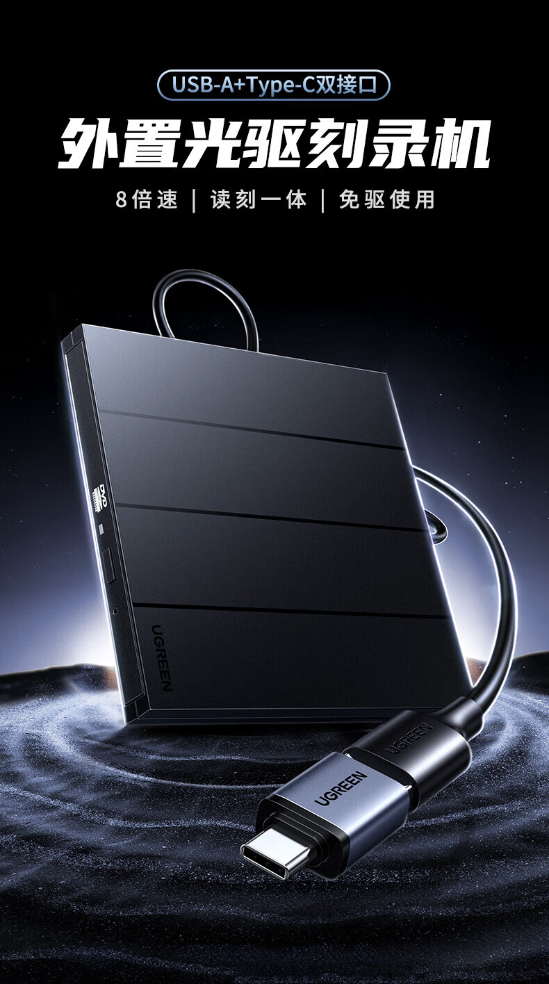 Unidad óptica móvil externa UGREEN de 8x de velocidad, grabadora de discos DVD, interfaz dual USB tipo C, adecuada para unidad óptica externa de computadora portátil y de escritorio, interfaz dual USB + tipo C, plug and play sin controlador
