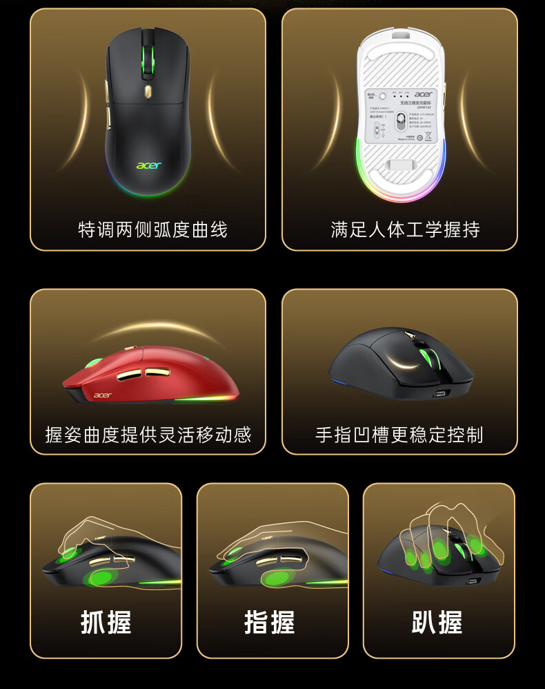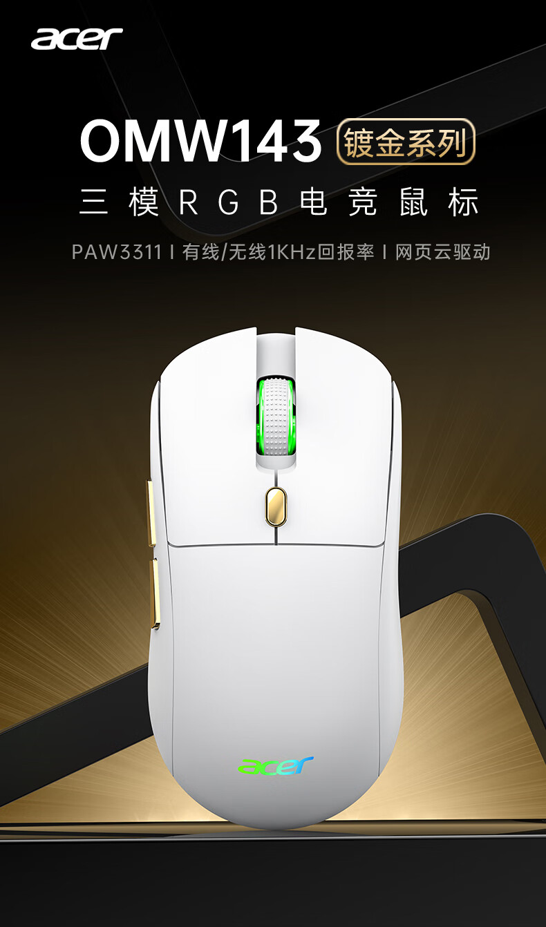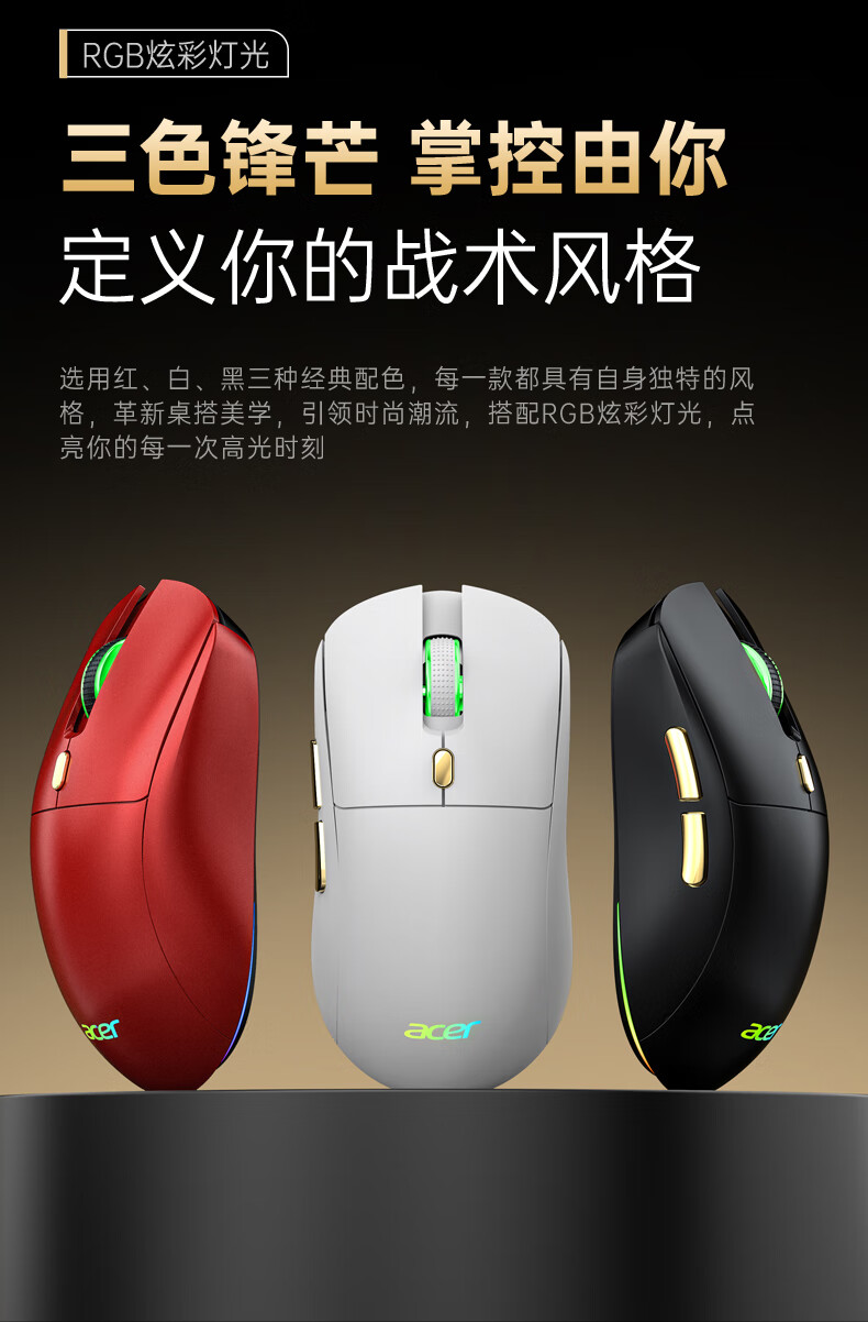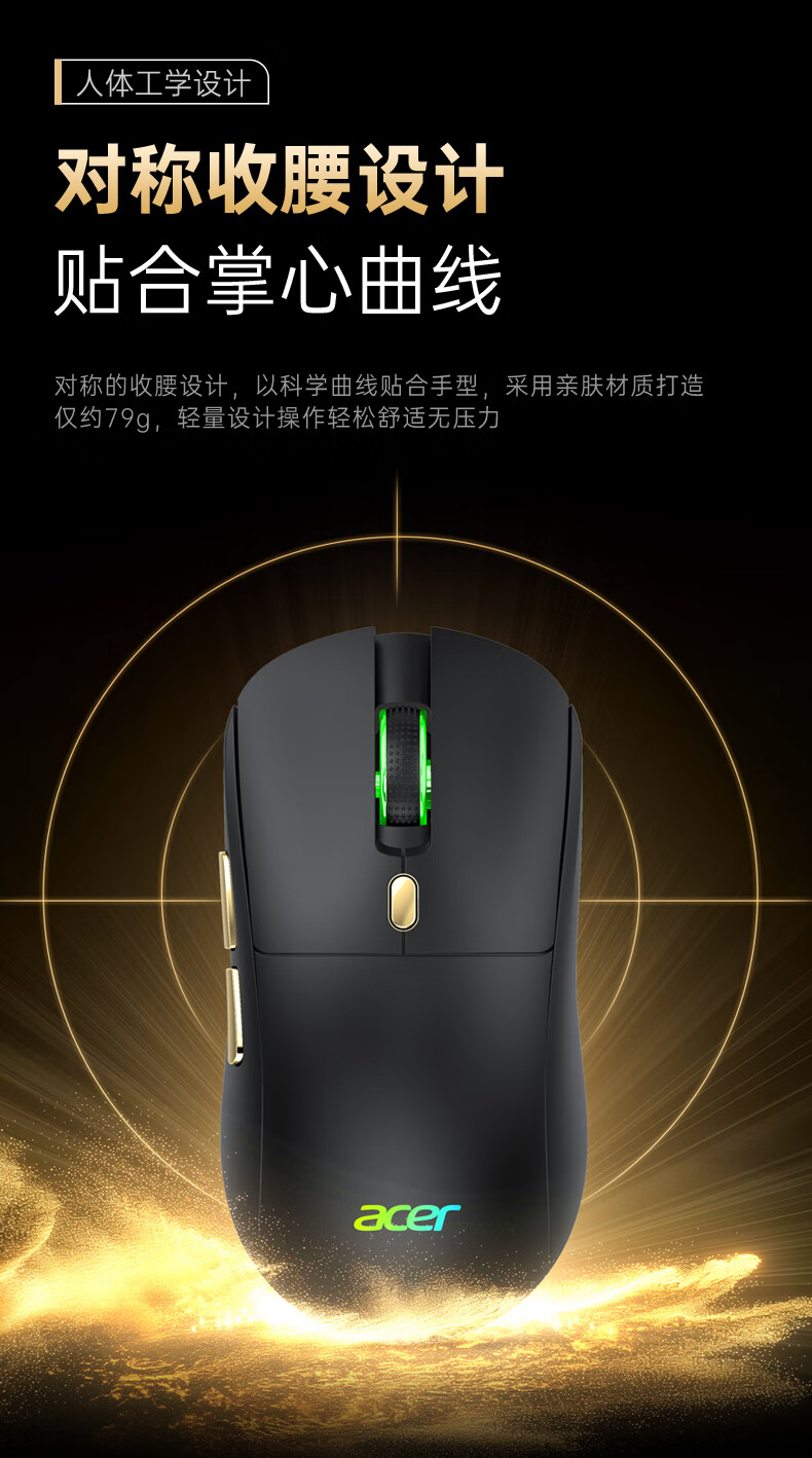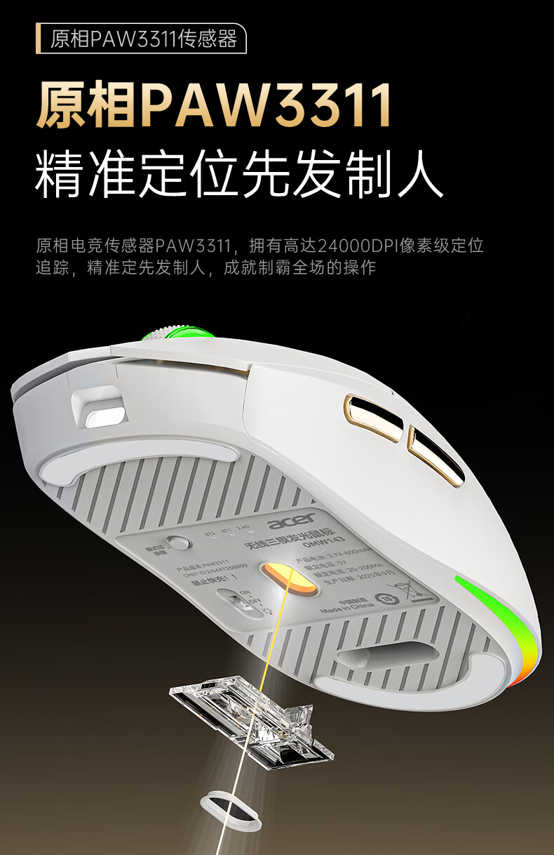 Acer Gaming-Maus mit drei Modi, kabelgebunden, kabellos, Bluetooth, RGB, Akku, programmierbarer Makrotreiber, Notebook, Desktop-Computer, Mobiltelefon, Tablet, IPAD, Büro, universell, Schwarz, Gold, Originalphase 3311-1K, Rücklaufquote 24000 DPI