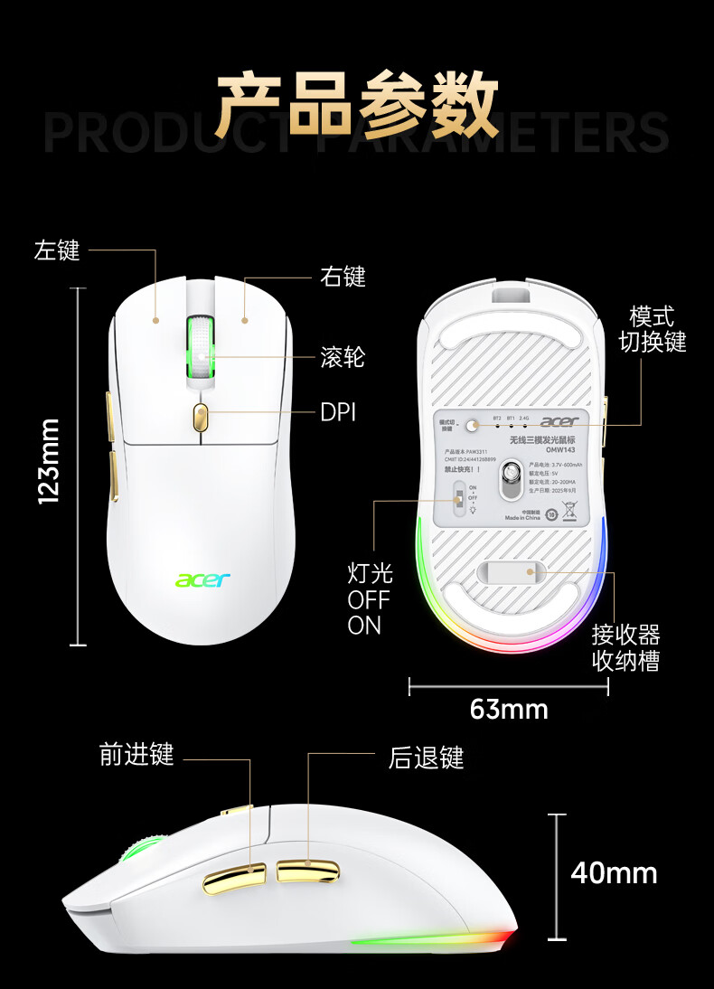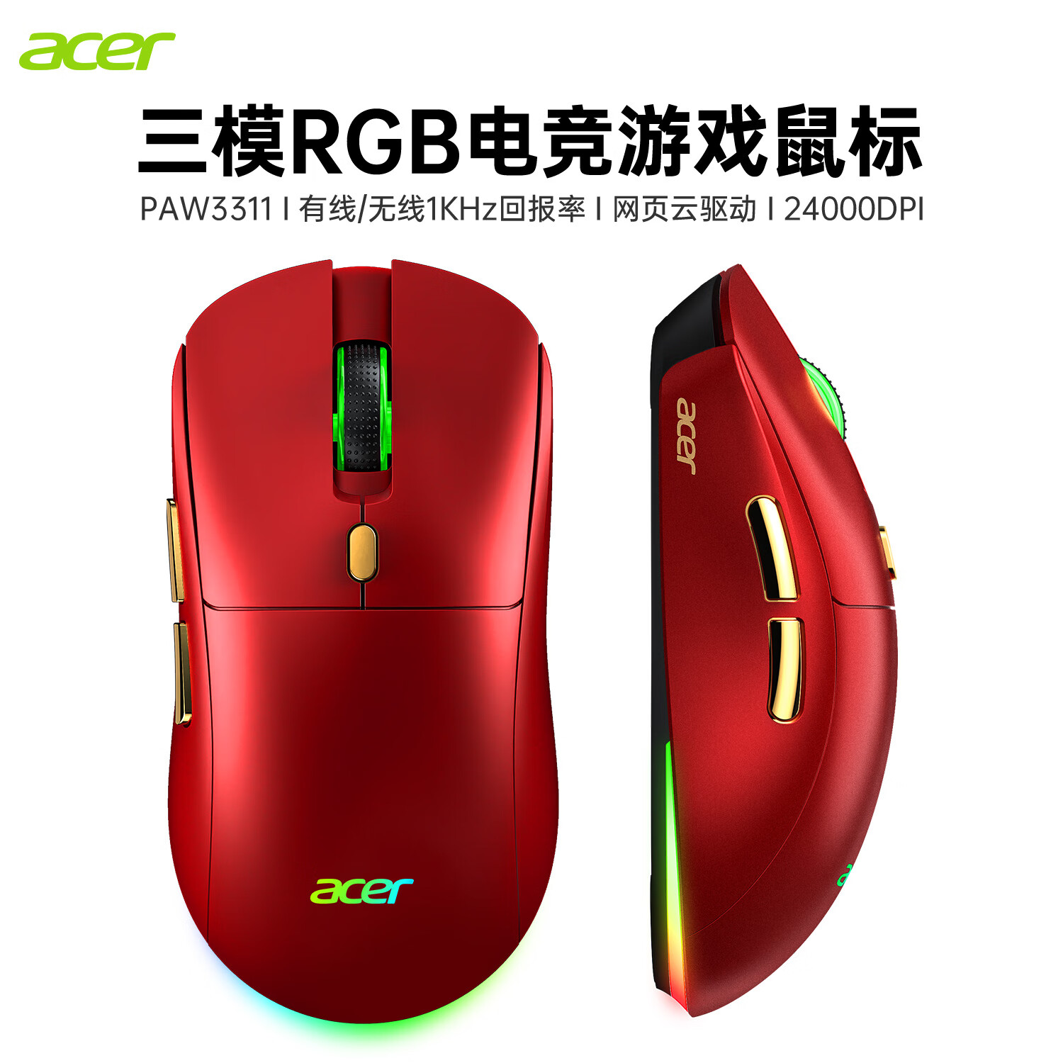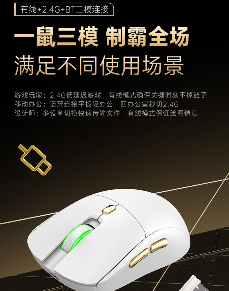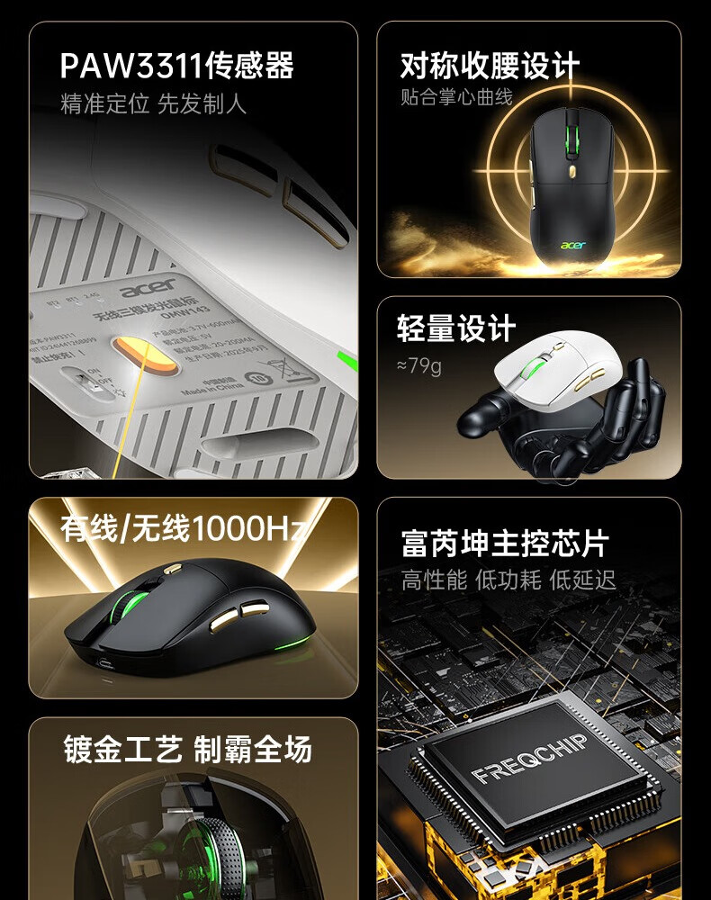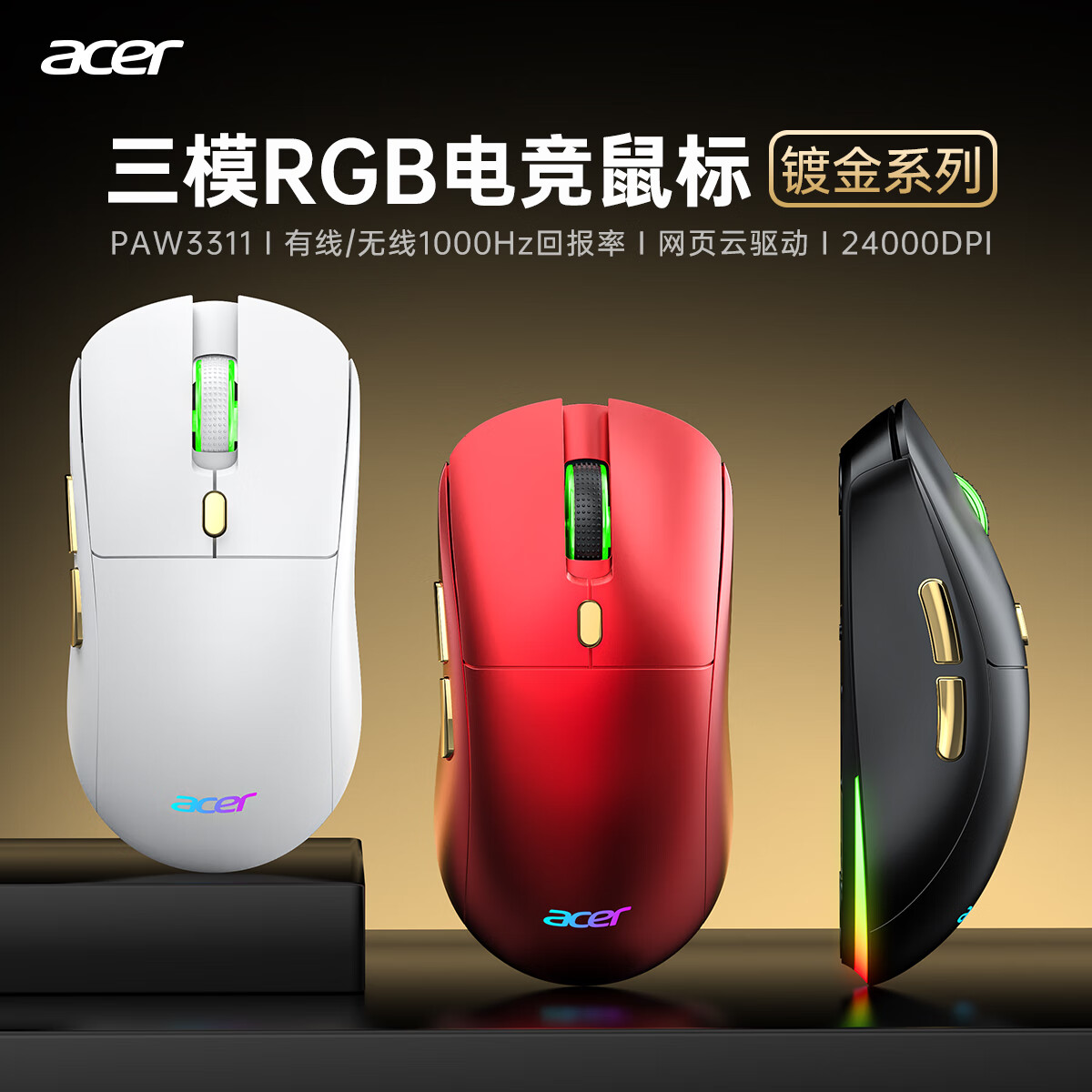 Acer Gaming-Maus mit drei Modi, kabelgebunden, kabellos, Bluetooth, RGB, Akku, programmierbarer Makrotreiber, Notebook, Desktop-Computer, Mobiltelefon, Tablet, IPAD, Büro, universell, Schwarz, Gold, Originalphase 3311-1K, Rücklaufquote 24000 DPI