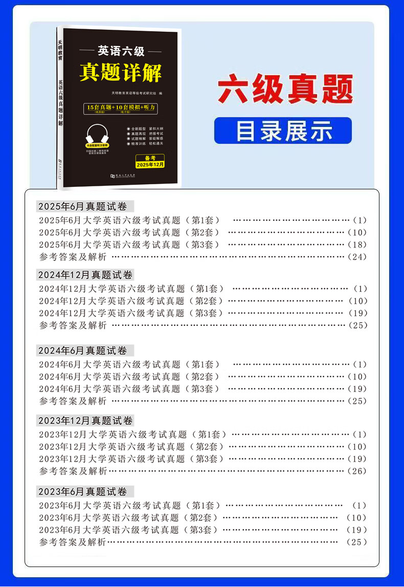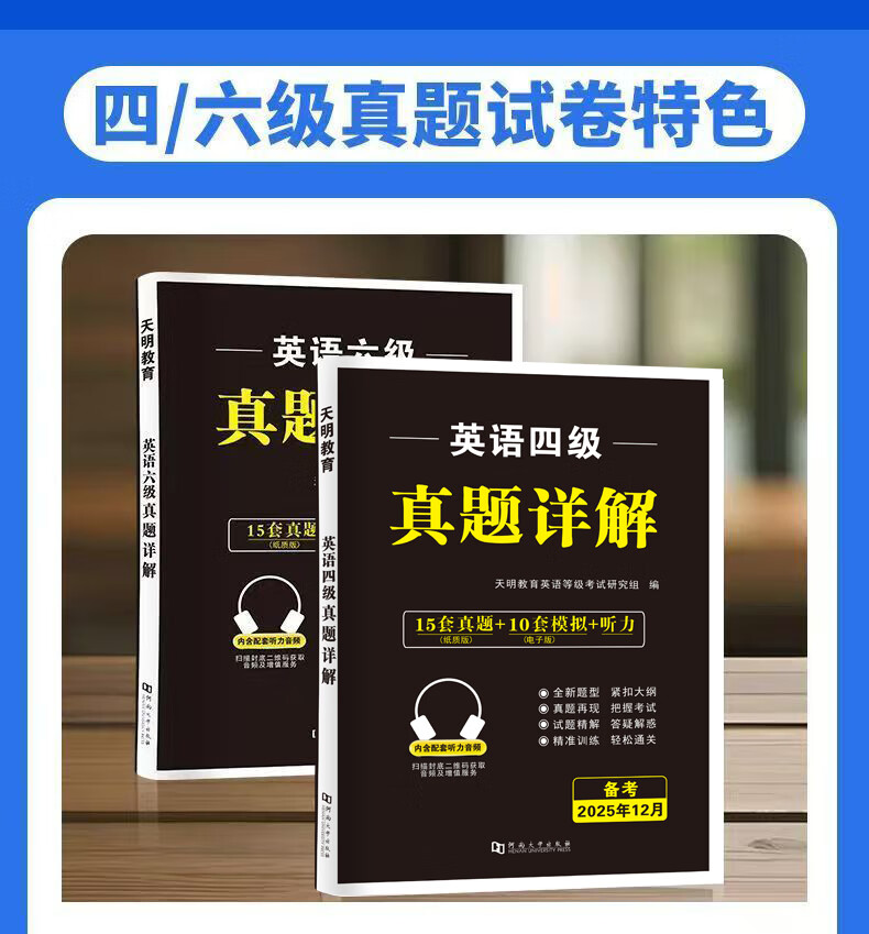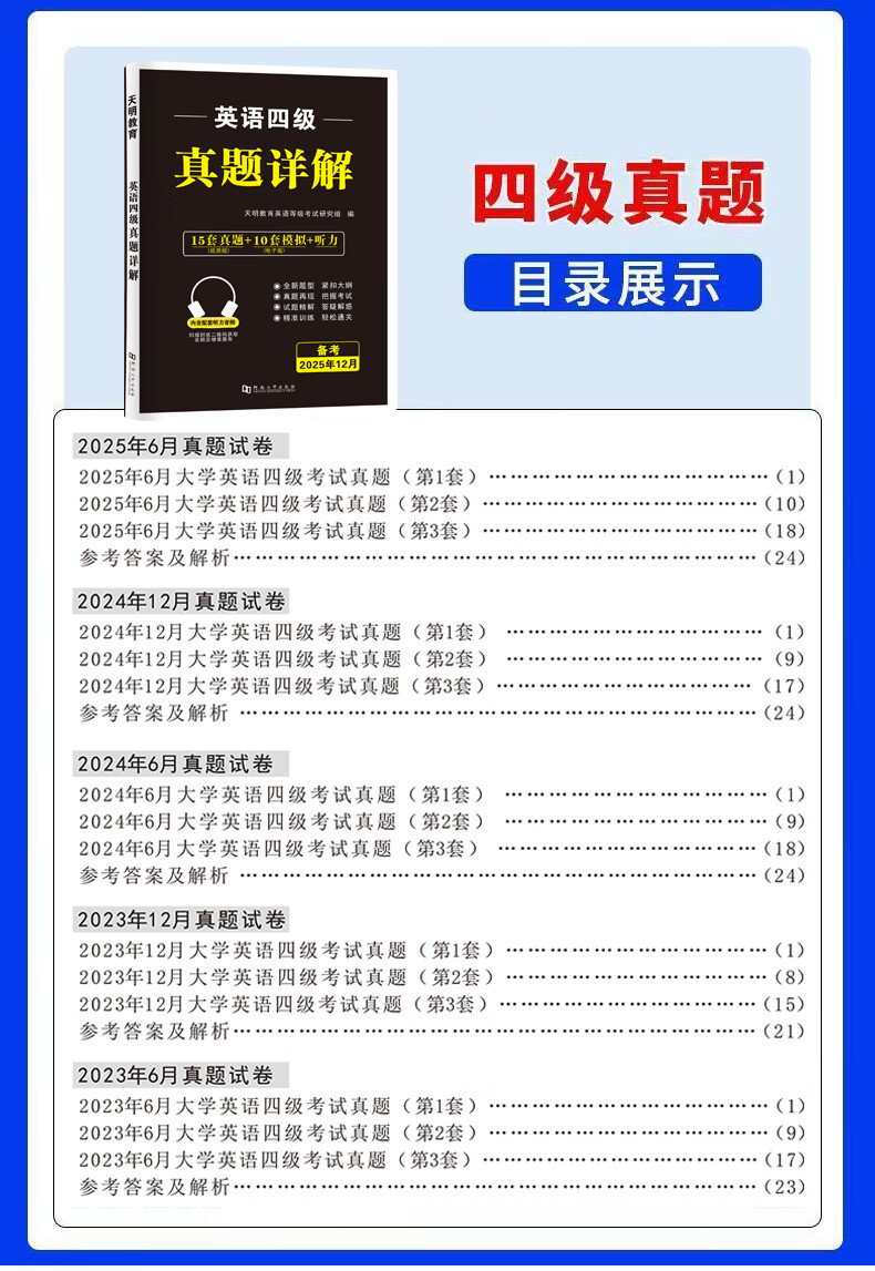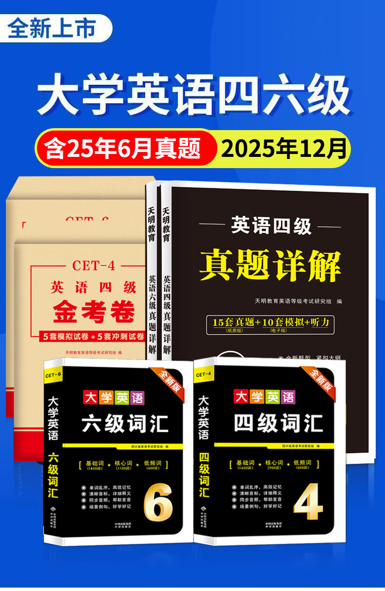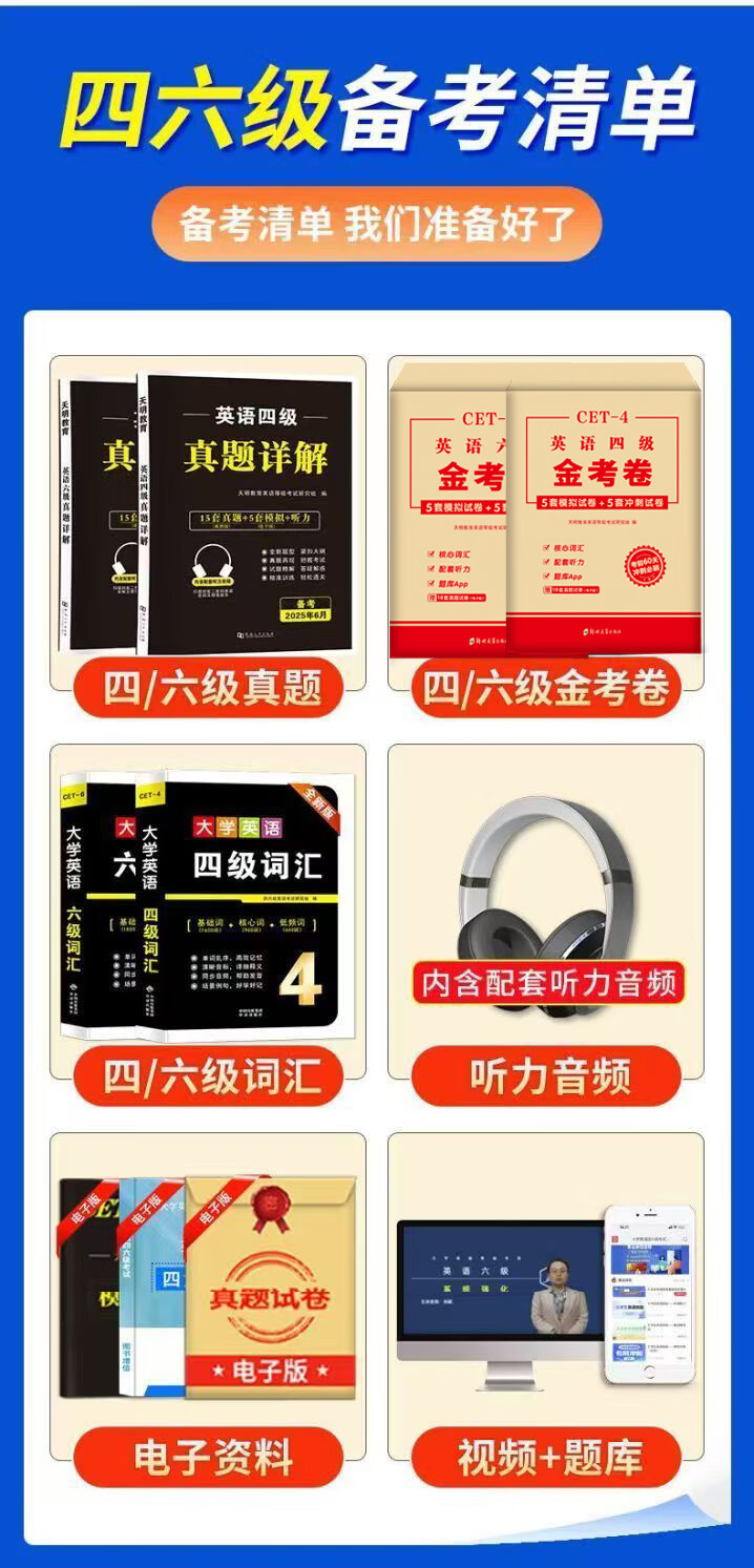 备考2025年12月大学英语四六级考试资料真题模拟题冲刺卷四级六级词汇书CET-4级46级模拟历年试卷真题单词卷子专项训练练习题刷题套卷听力音频资料真题详细解析 四级【15套真题+词汇+金考卷+1张答
