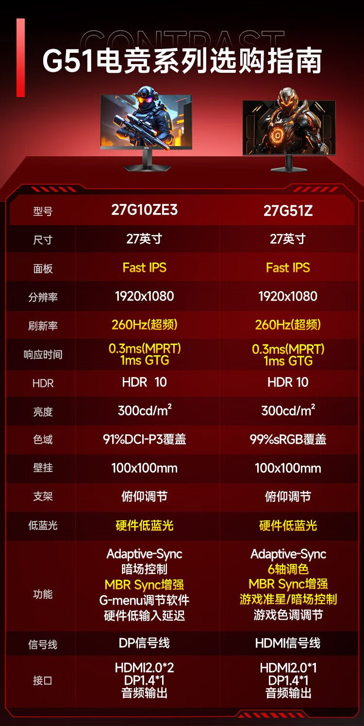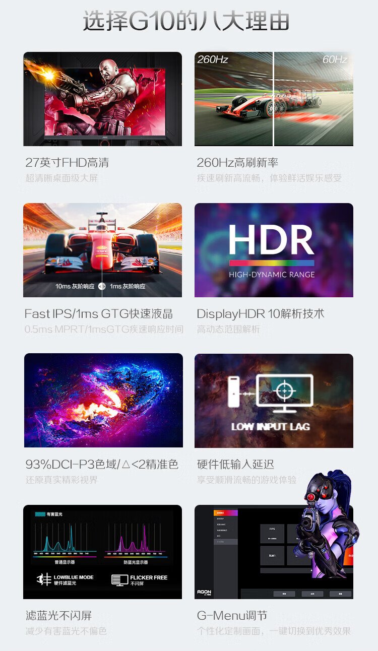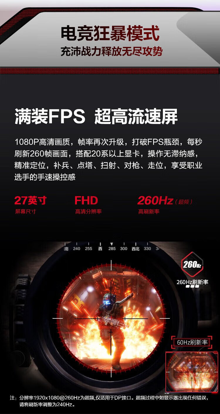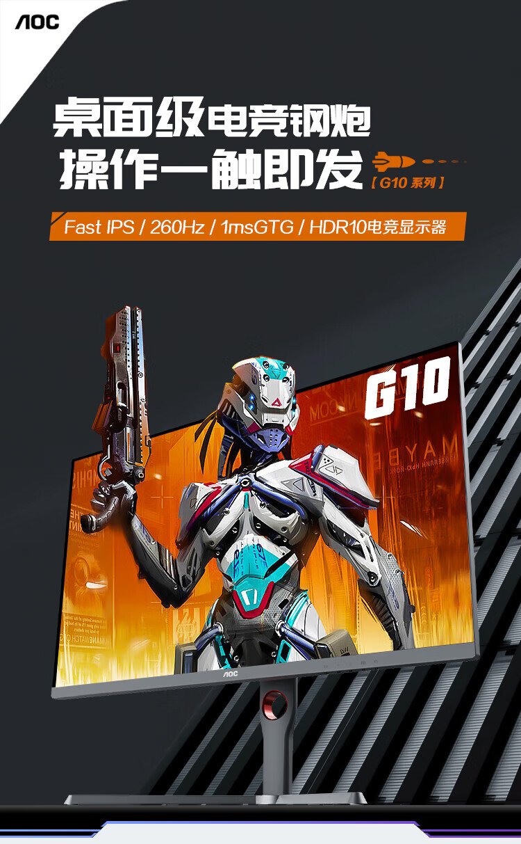 AOC 27英寸240HZ超频260电竞显示器 FastIPS快速液晶0.5MS响应 游戏电脑屏幕HDR10 【升级】260Hz硬件低蓝光 27G51Z