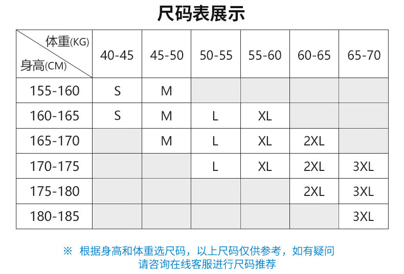 China (cm) 165 / 88-90 170 / 96-98 175 / 108-110 180 / 118-122 185 / 126-130