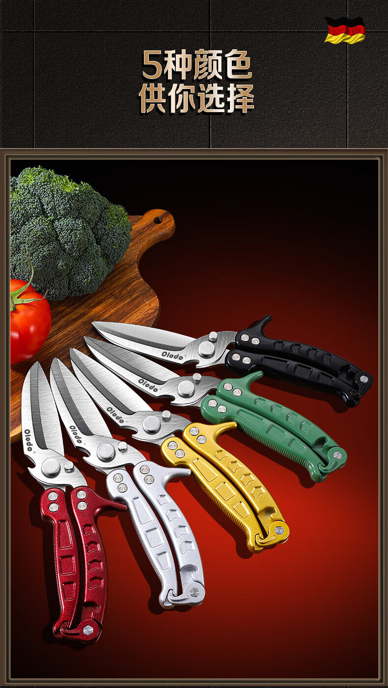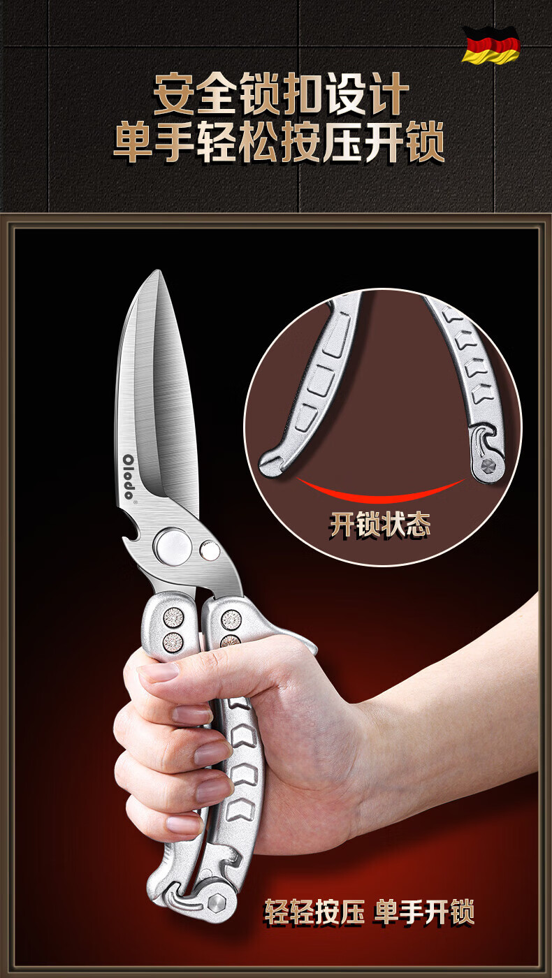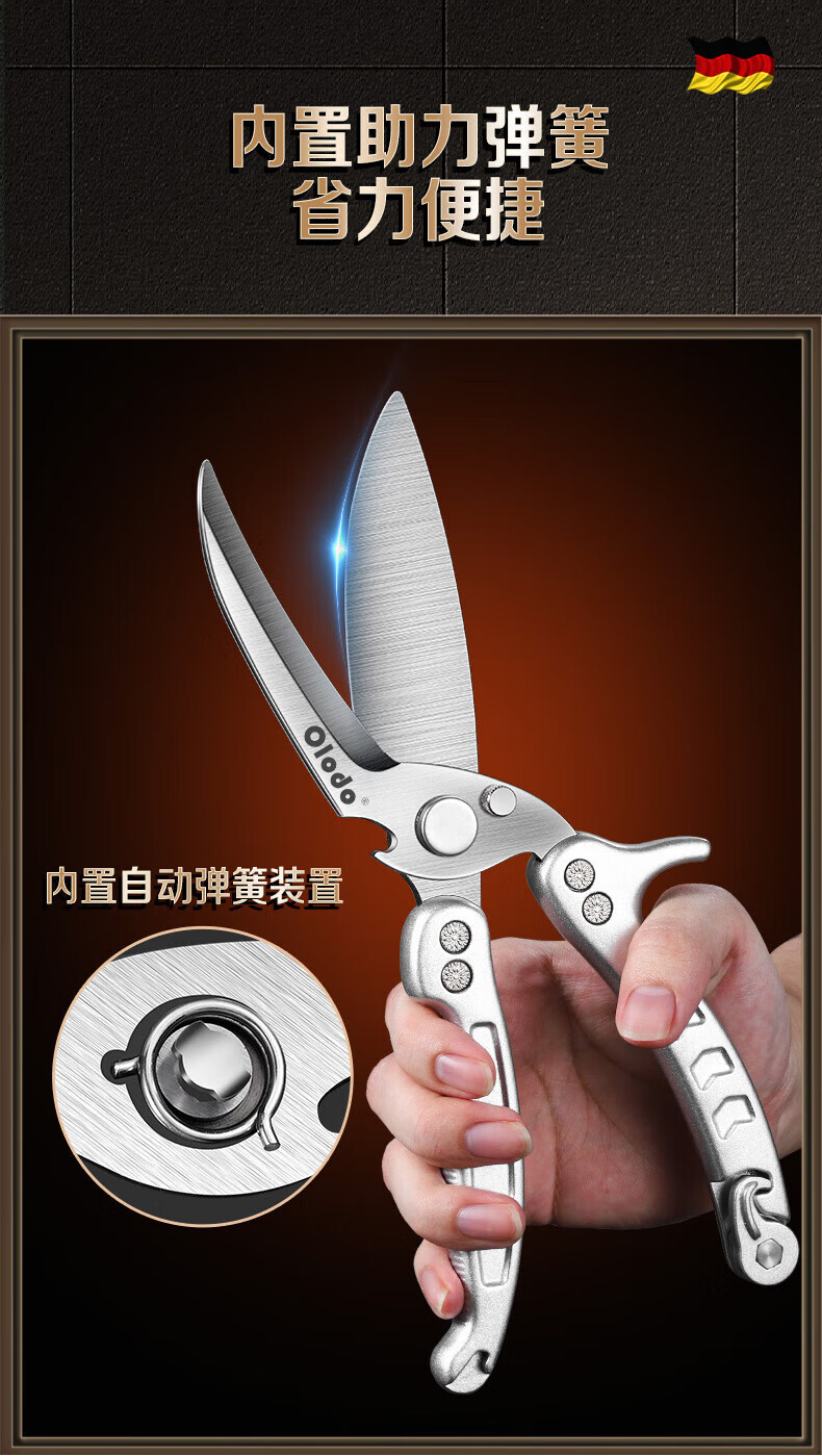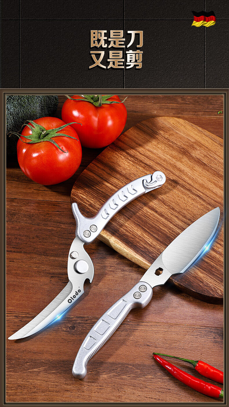 Olodo leistungsstarke Küchenschere, Hühnerknochenschere, Haushaltsküchenschere, Edelstahlschere, Grillschere, Knochenschere, natürliches Silber, geschnittene Knochen + geschnittene Früchte + offene Flaschenverschlüsse