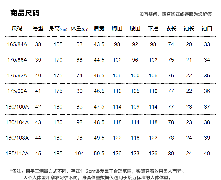 China (cm) 160-165/84-86 165-170 / 88-90 167-172 / 92-96 168-173 / 98-102 170-176 / 106-110