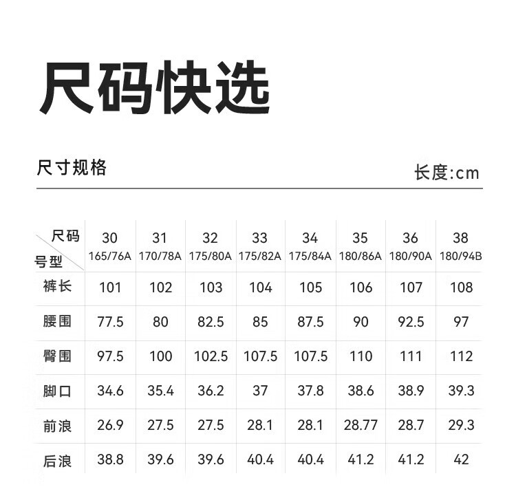 Outseam (cm) 99 cm 101.5 cm 104 cm 106.5 cm 109 cm