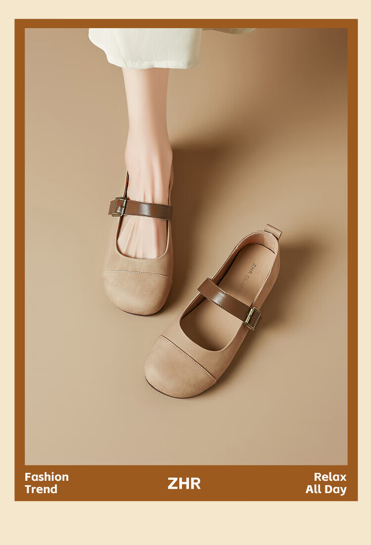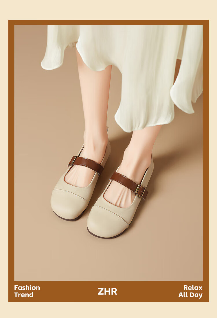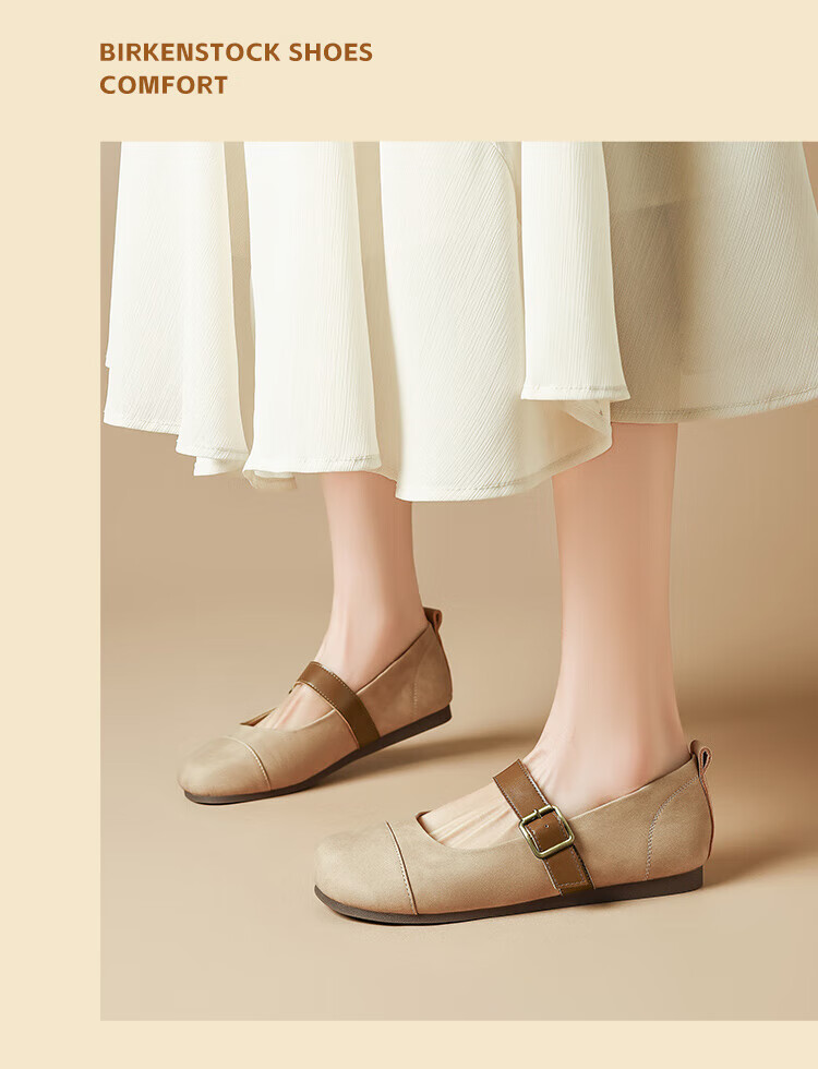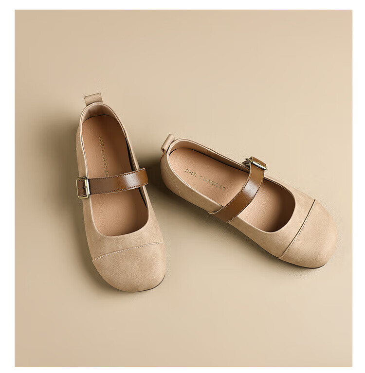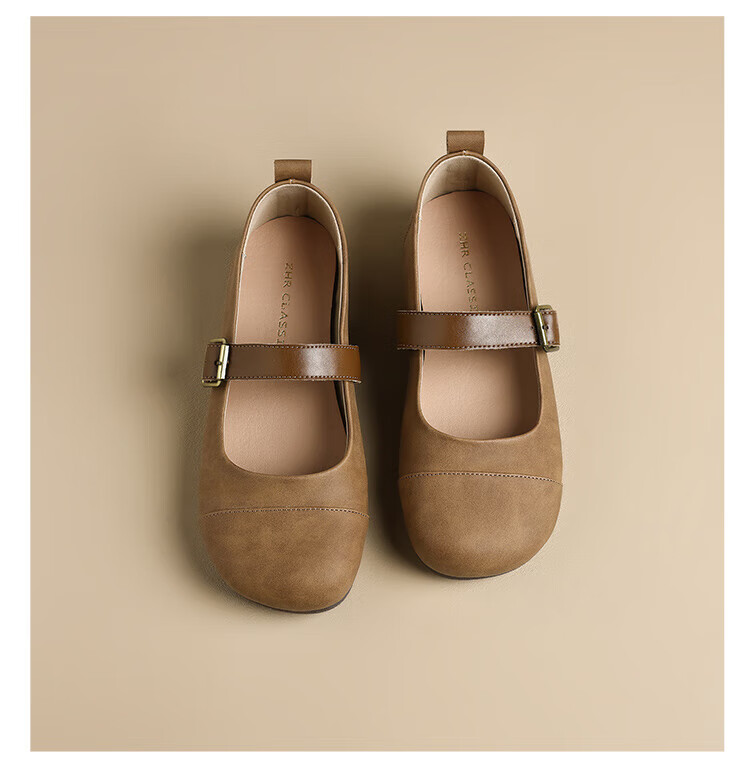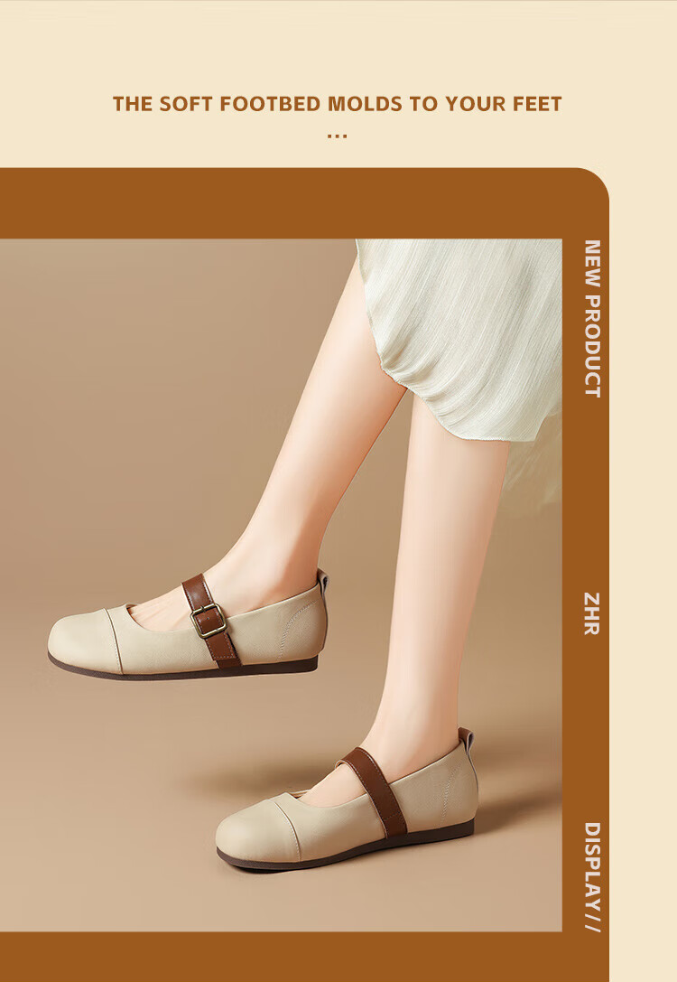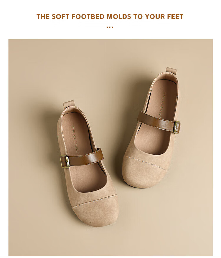 ZHR single shoes for women retro round toe flat bottom Birkenstock Mary Jane women's shoes versatile soft leather shoes for women JF152 apricot 37