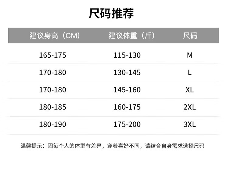 China (cm) 165 / 88-90 170 / 96-98 175 / 108-110 180 / 118-122 185 / 126-130