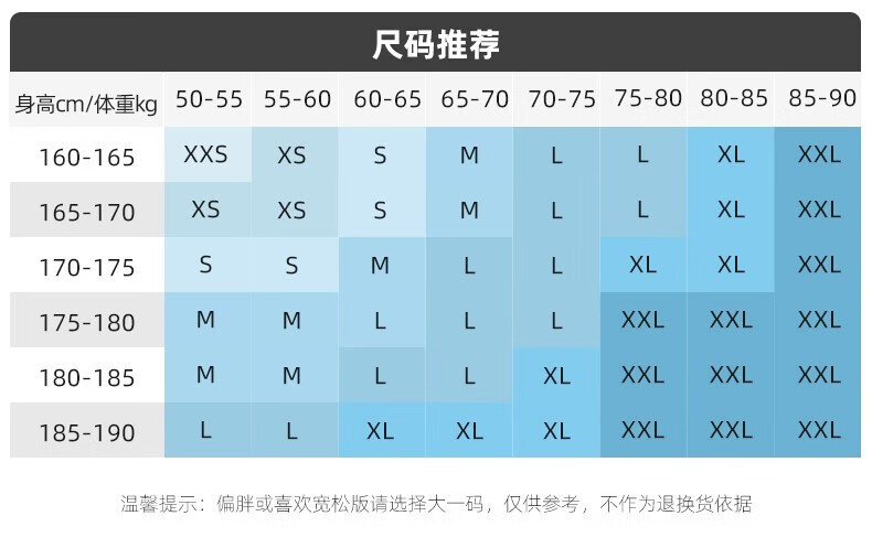China (cm) 165 / 88-90 170 / 96-98 175 / 108-110 180 / 118-122 185 / 126-130