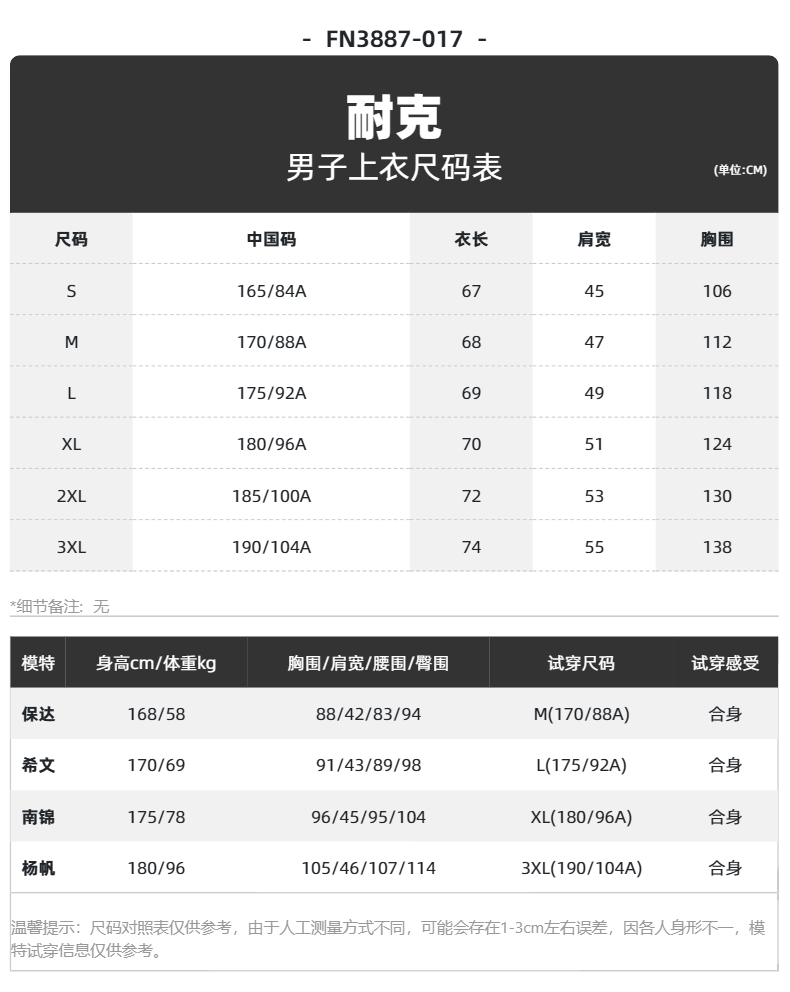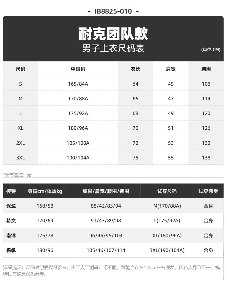China (cm) 165 / 88-90 170 / 96-98 175 / 108-110 180 / 118-122 185 / 126-130