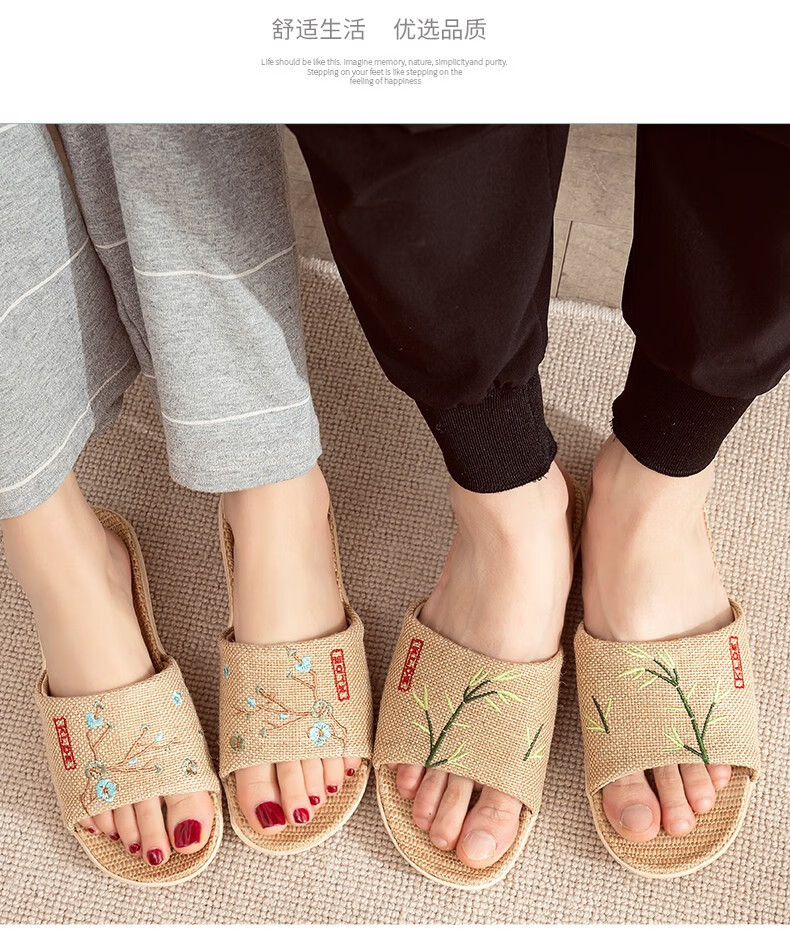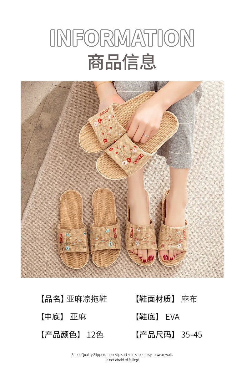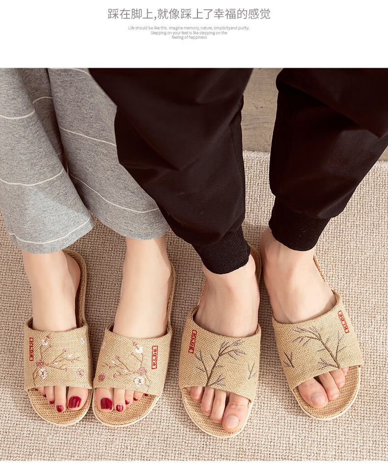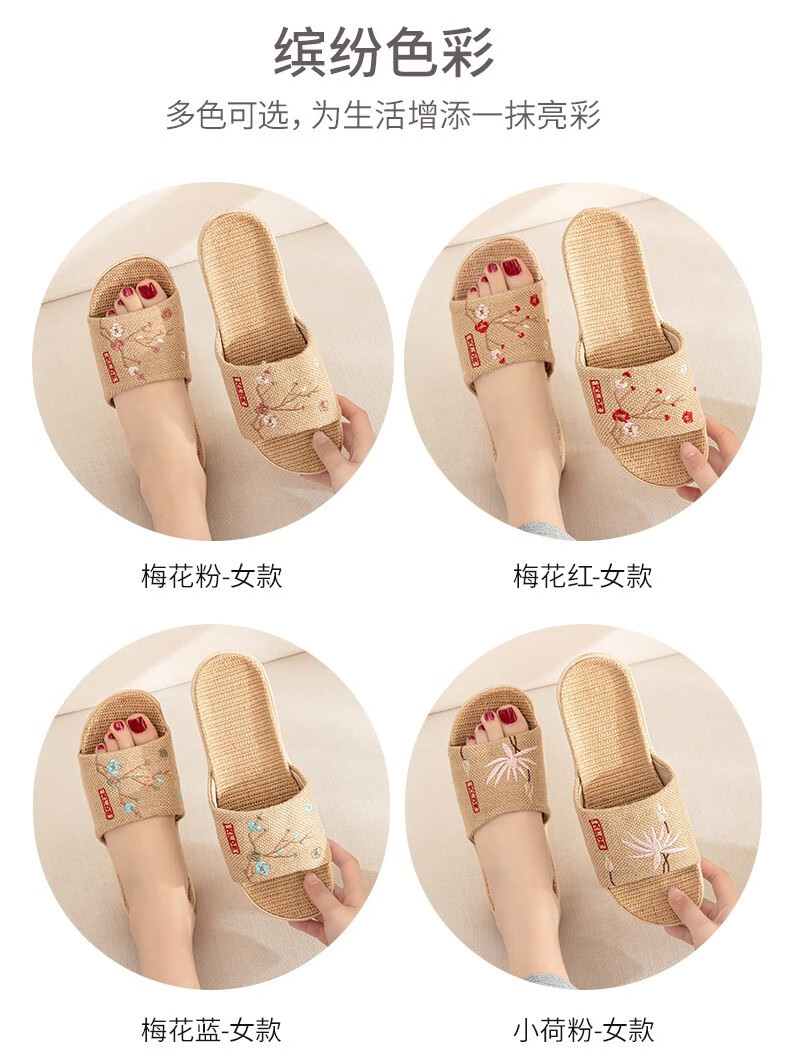 熠牧夏季中国风亚麻拖鞋男女居家情侣防滑软底家用地板绣花麻布凉拖鞋 女款梅花红 37-38 (250mm) 女款