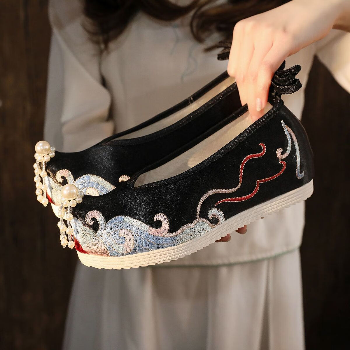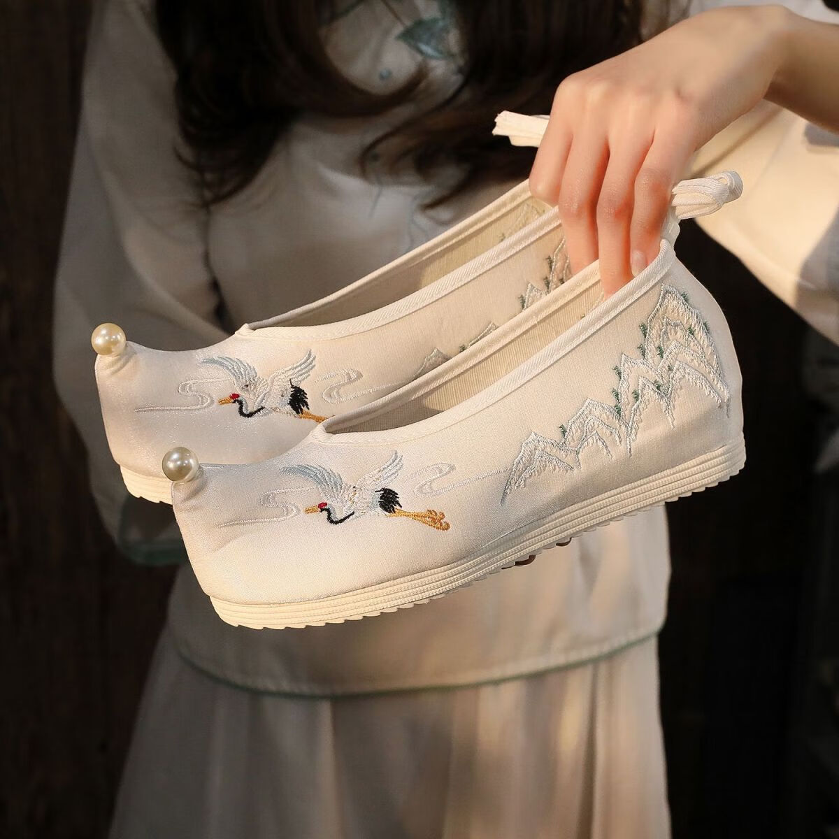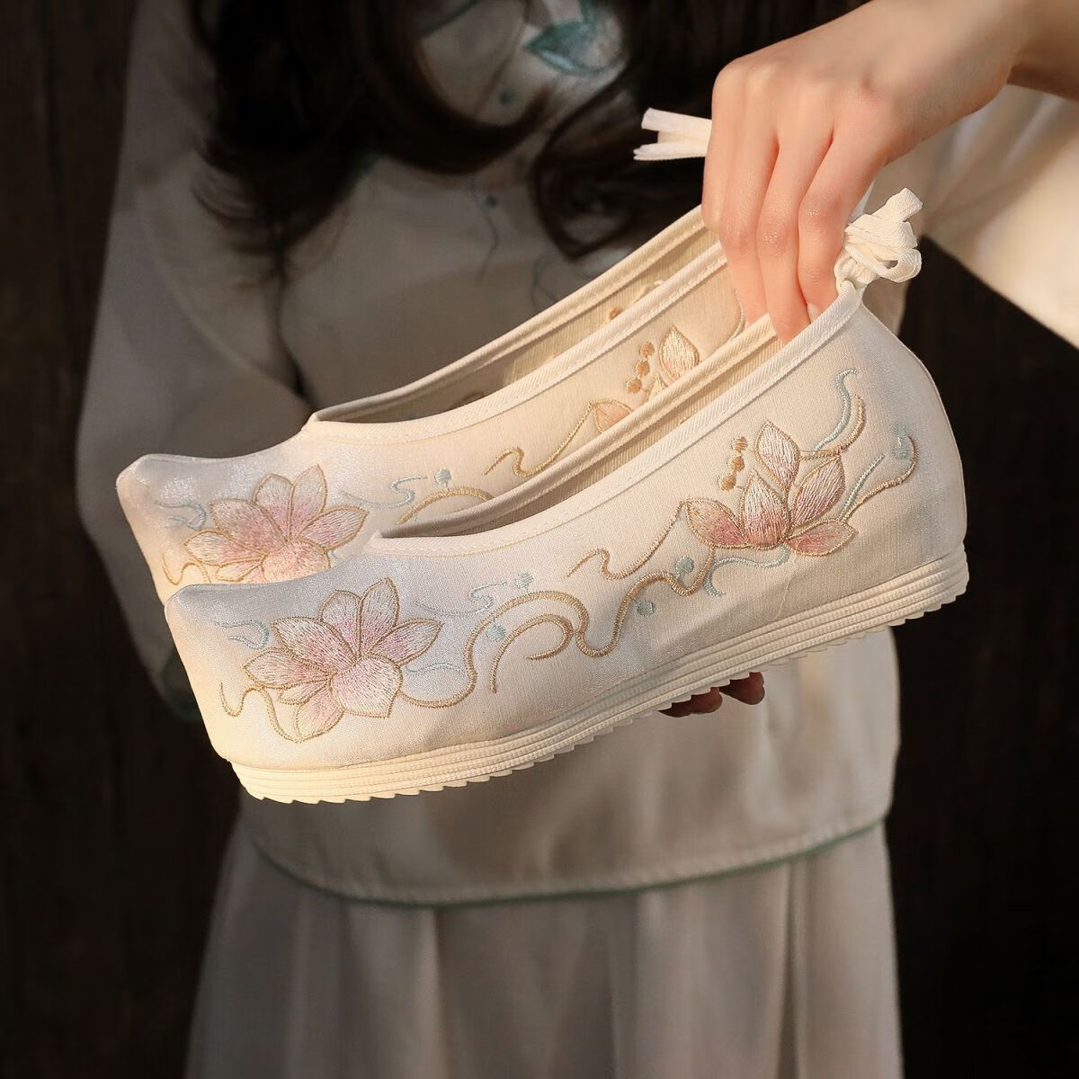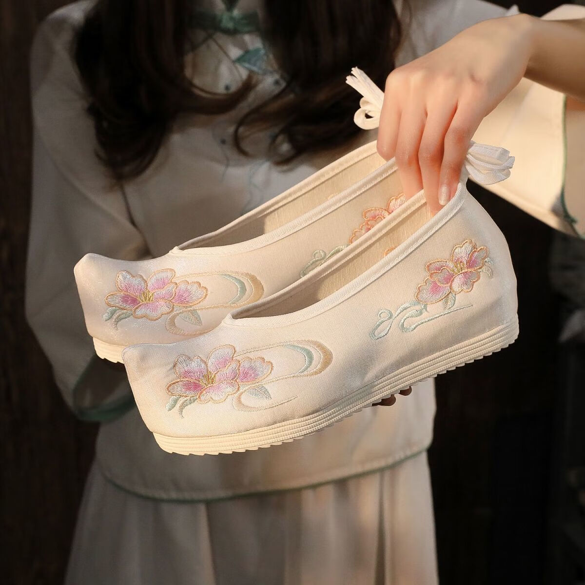 Mofu Hanfu Shoes for Female Students Ancient Style Embroidered Shoes for Women with Hanfu Inner Heightening Ancient Style Shoes Han Element Cloth Shoes Yun Bailian (6.6cm) Pearl White 37