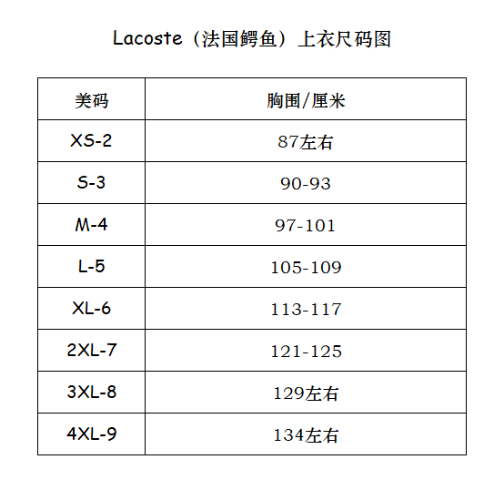 China (cm) 165 / 88-90 170 / 96-98 175 / 108-110 180 / 118-122 185 / 126-130