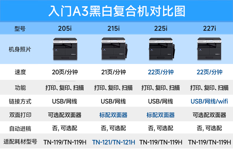 Konica Minolta 205i 215i 225i 227i a3 impresora fotocopiadora A4 láser blanco y negro multifunción todo en uno escaneo red oficina compuesta máquina 227i+ duplexor (puede imprimir automáticamente a doble cara)