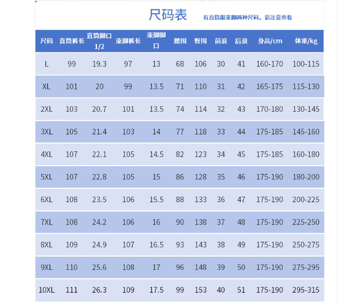 Outseam (cm) 99 cm 101.5 cm 104 cm 106.5 cm 109 cm