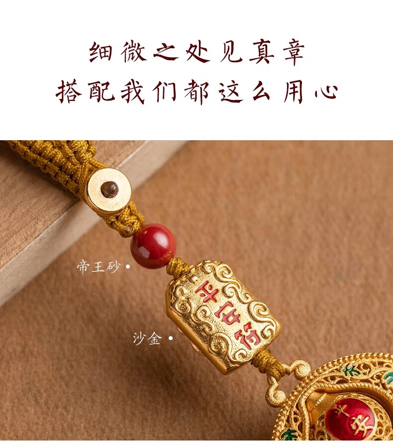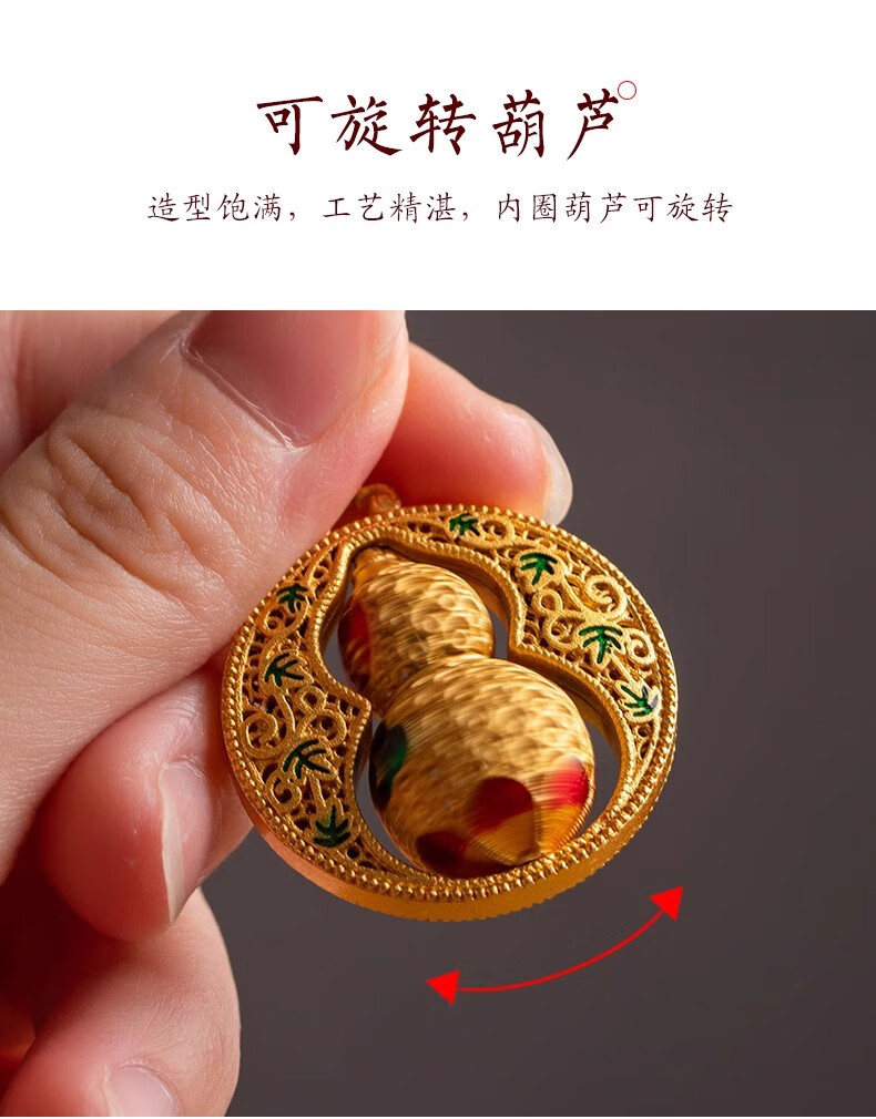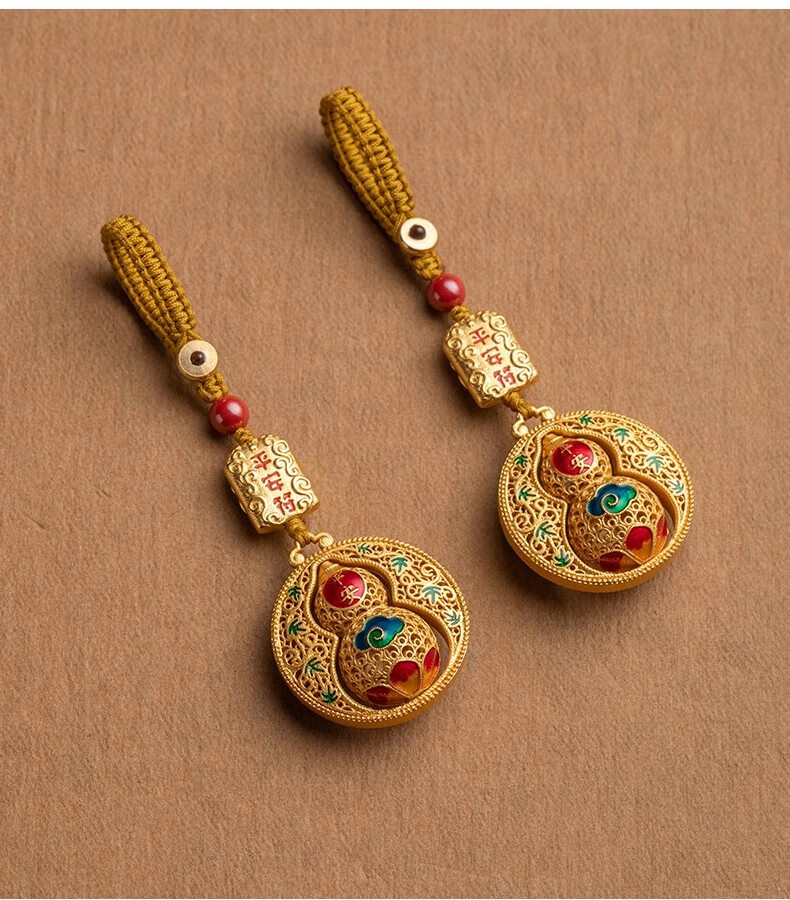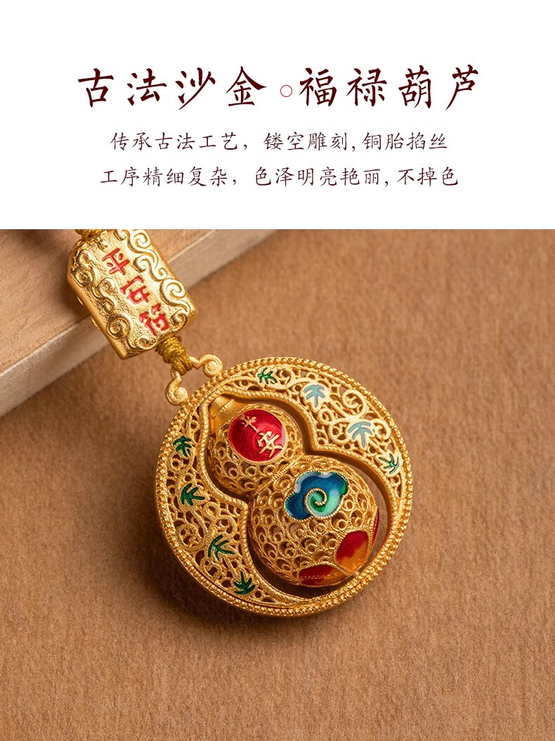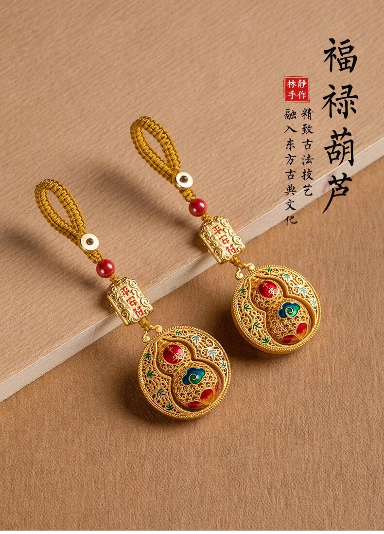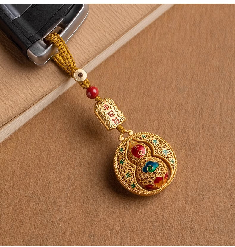 All-selected sand gold safety gourd car keychain, ancient French style retro key pendant, men's and women's pendant rope chain gift, gift box, safety charm, rotatable gourd