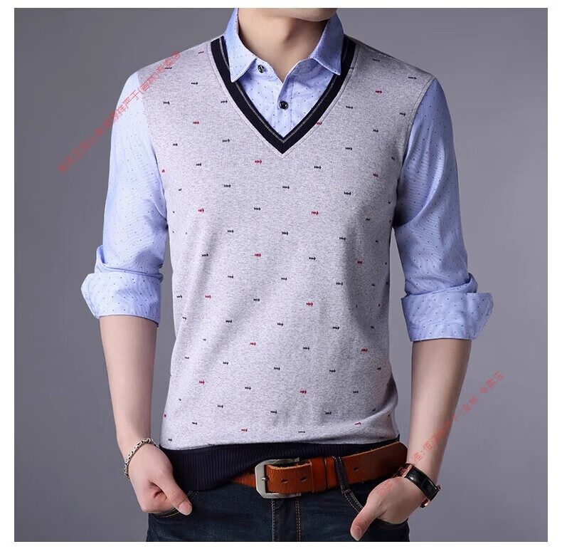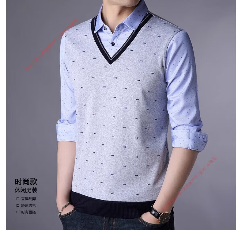 Hengyuanxiang men's fake two-piece sweater autumn long-sleeved T-shirt casual bottoming sweater men's middle-aged dad's top autumn 3878 red 170/L