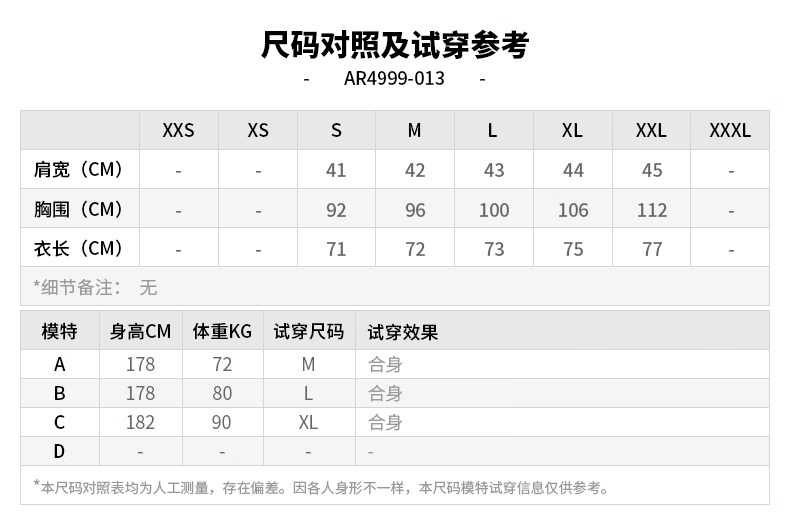 China (cm) 160-165/84-86 165-170 / 88-90 167-172 / 92-96 168-173 / 98-102 170-176 / 106-110