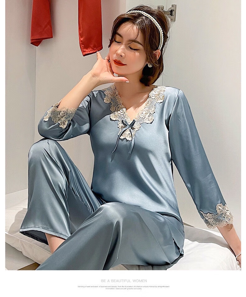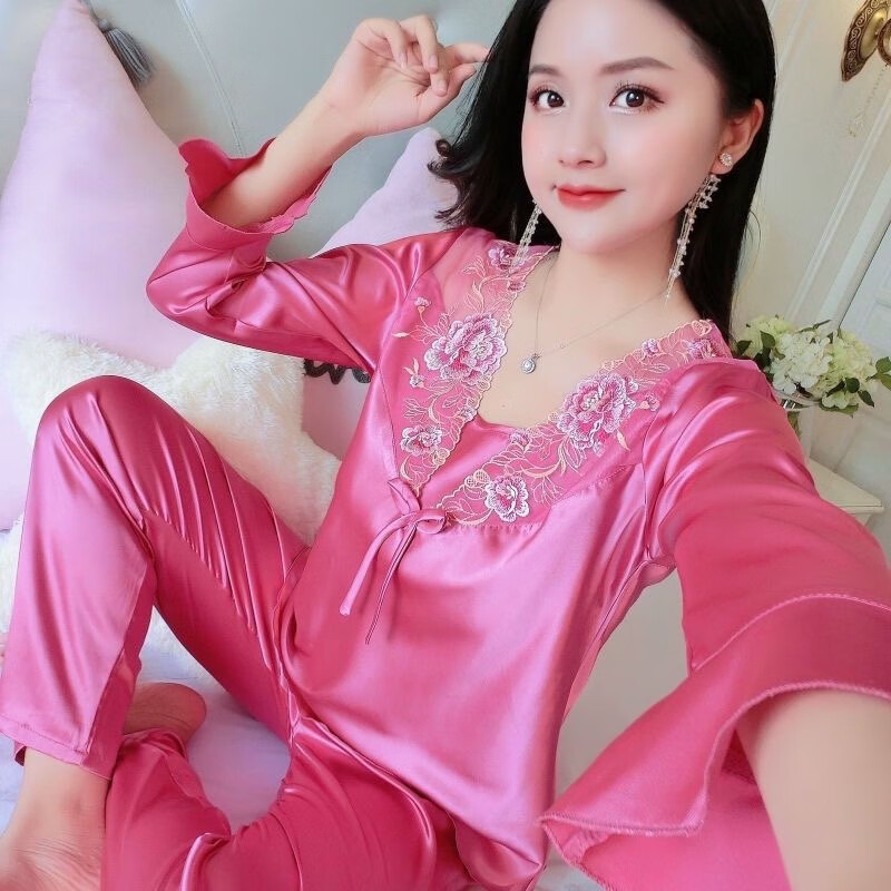 浪莎睡衣女夏季长袖长裤两件套家居服性感绸缎仿真丝女士可爱套装 长-袖9856浅粉套 M M【80-100斤】