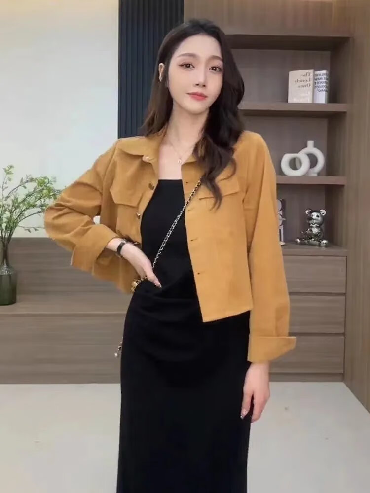 Otoño Moonlight Yiren Primavera Nuevo 2025 Primavera Nueva chaqueta de camisa cepillada de estilo coreano para mujer Falda con tirantes plisada Conjunto de dos piezas de moda Chaqueta marrón + falda larga de color albaricoque-9852# Conjunto M 98-108Jin Jin es igual a 0,5 kg