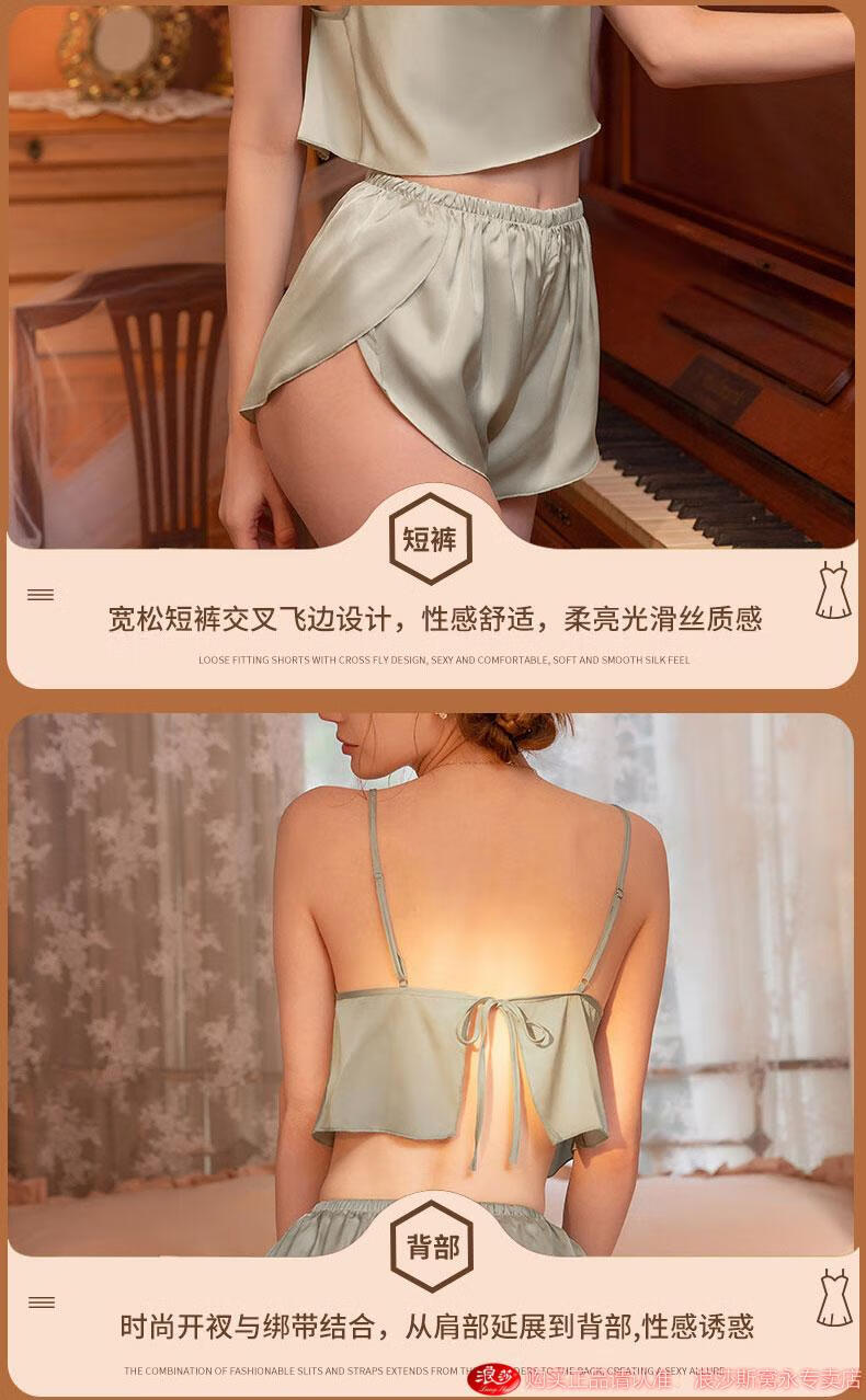 LangSha silk sexy pajamas for women spring and summer two-piece suit vest suspender shorts pure lust style home clothes 2025 new 6630 hanging short suit - light green M