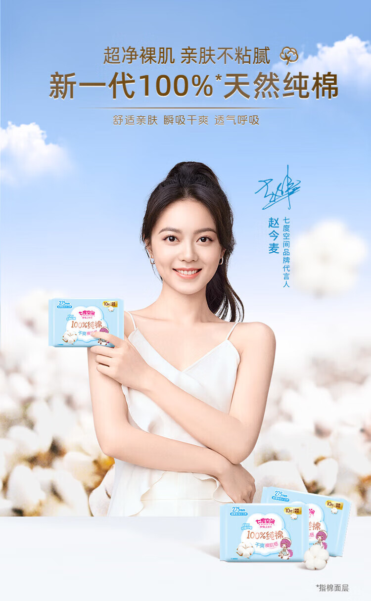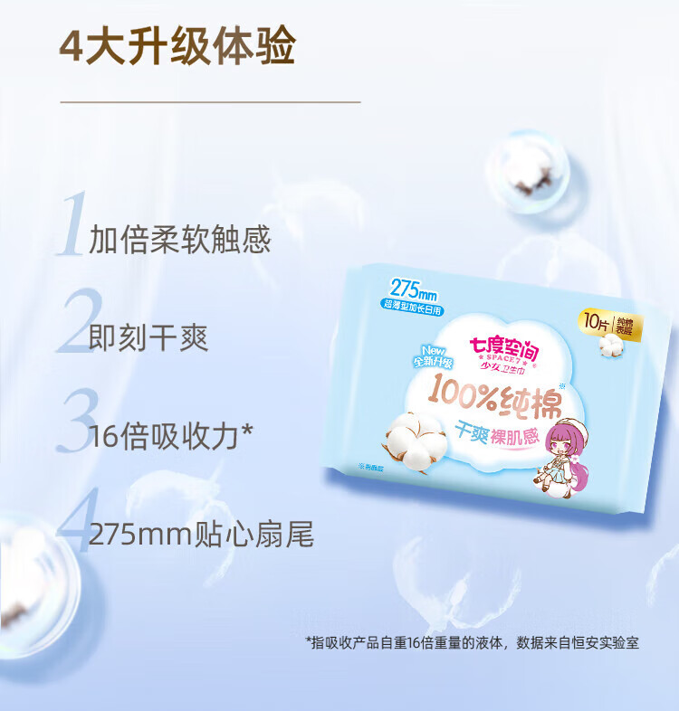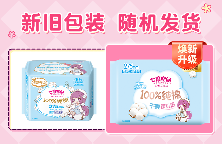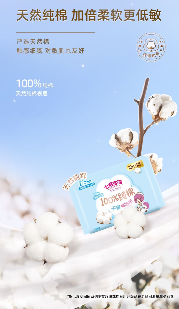 SPACE 7 sanitary napkin for girls, pure cotton, soft night use, student napkin, 245mm, 10 pieces/pack QSC6210, 50 pieces, 275mm pure cotton - 5 packs