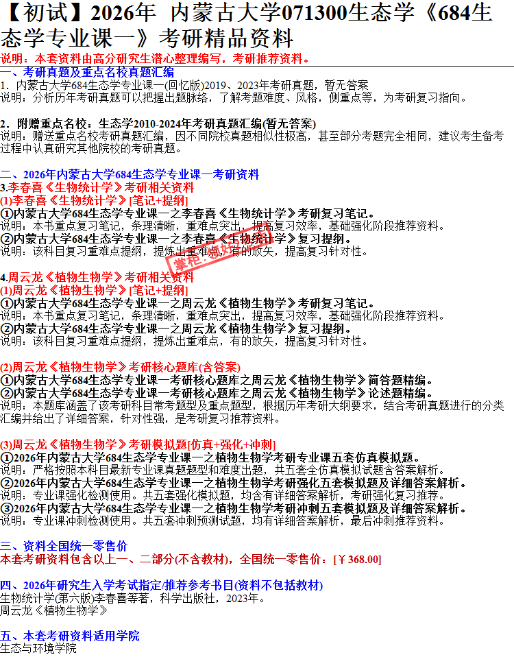 2026 Inner Mongolia University 684 Ecology Professional Course 1 Postgraduierten-Aufnahmeprüfung Exzellente Materialien