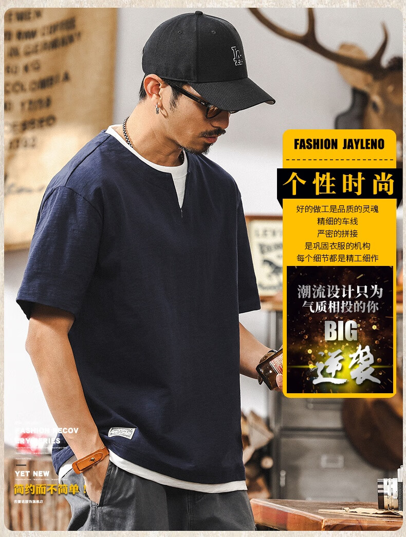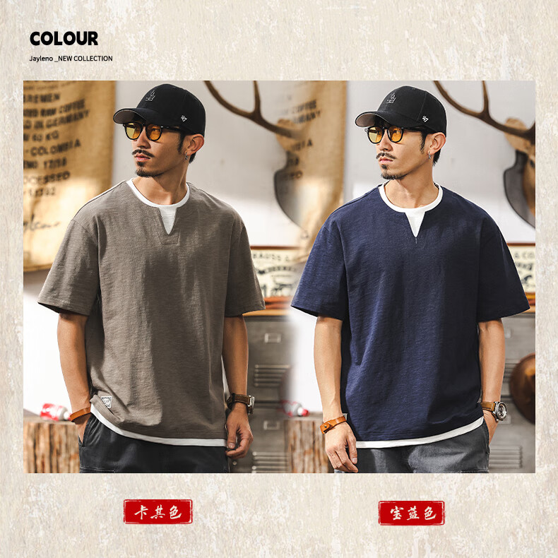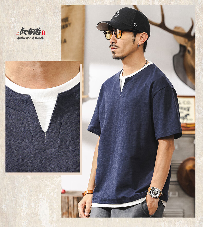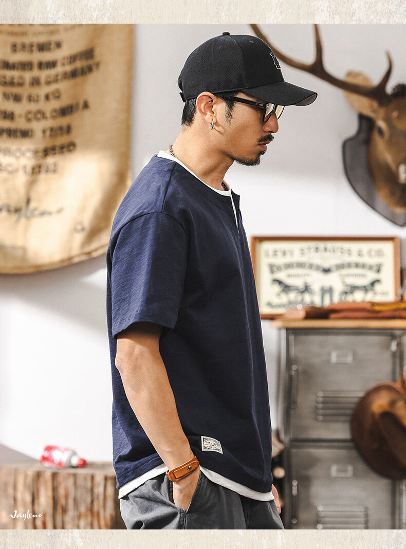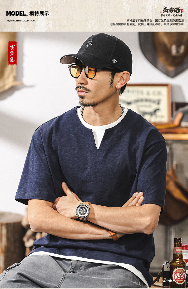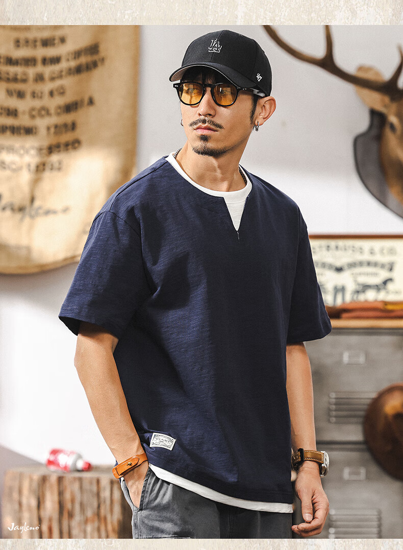 Jay Leno fake two-piece bamboo cotton men's T-shirt short-sleeved summer trendy brand 230g heavy cotton American retro henley shirt for men royal blue heavy 230g 3XL suitable for 180-200Jin Jin is equal to 0.5 kg