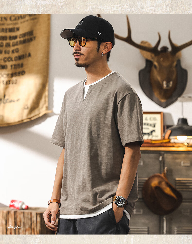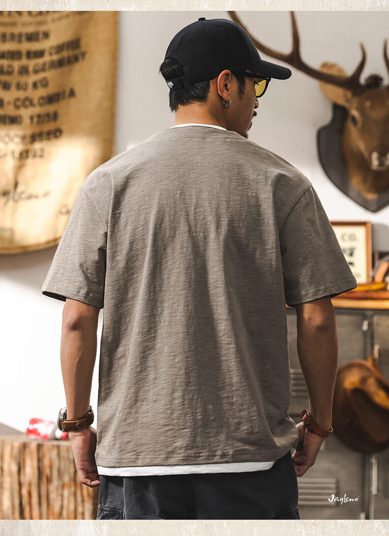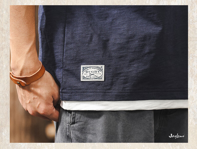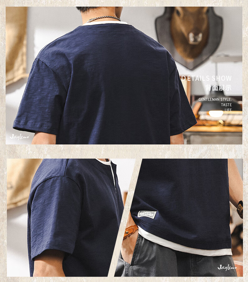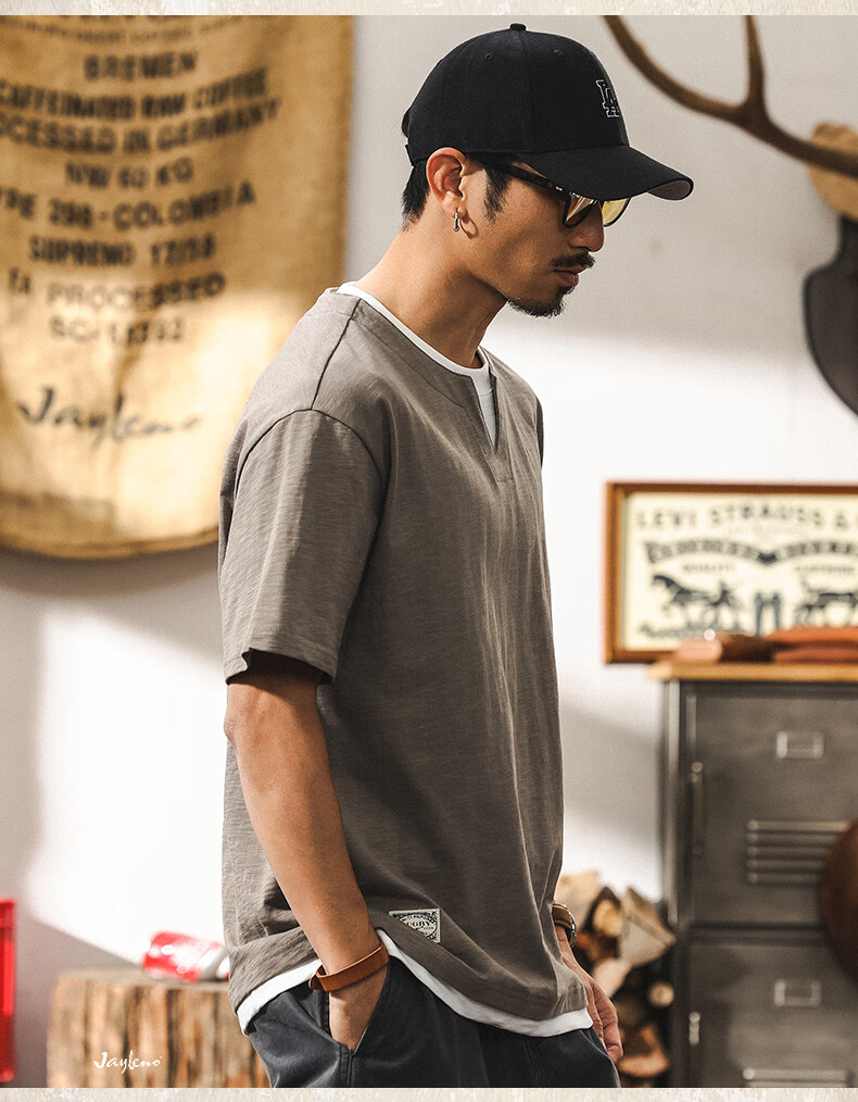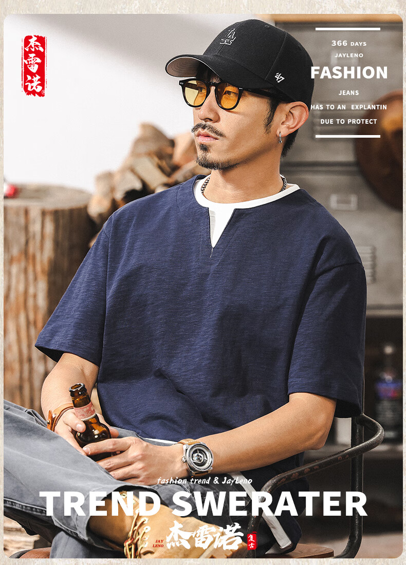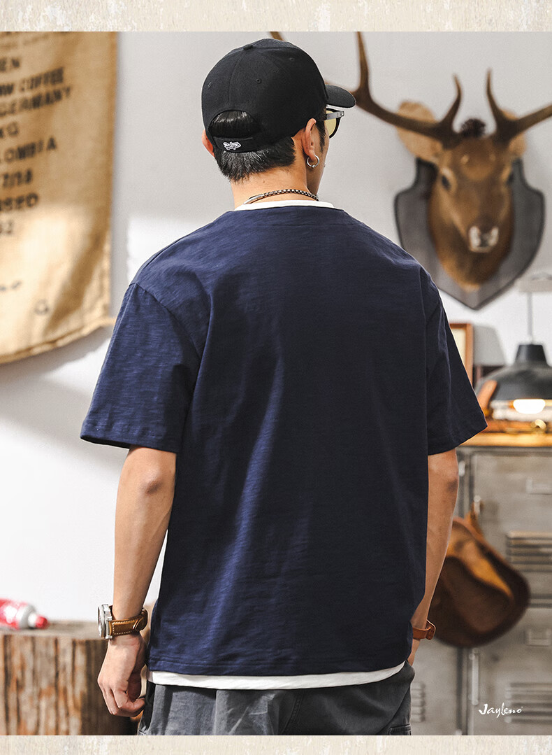 Jay Leno fake two-piece bamboo cotton men's T-shirt short-sleeved summer trendy brand 230g heavy cotton American retro henley shirt for men royal blue heavy 230g 3XL suitable for 180-200Jin Jin is equal to 0.5 kg