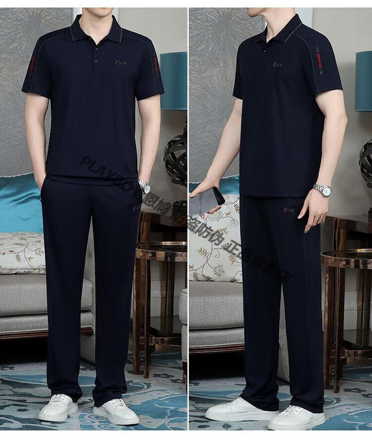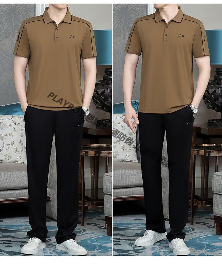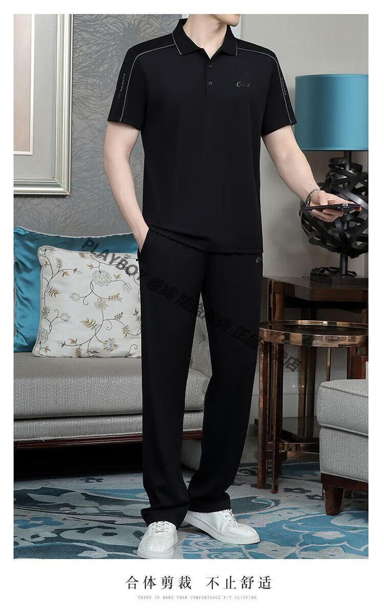 花花公子(PLAYBOY)夏季新款中老年人男士父亲装翻领短袖棉质体恤长裤跑步运动服套装 冰丝款753灰色 3XL 【建议160斤---180斤】体恤+