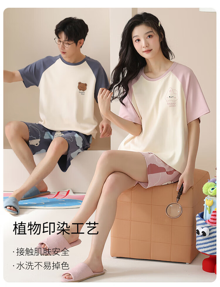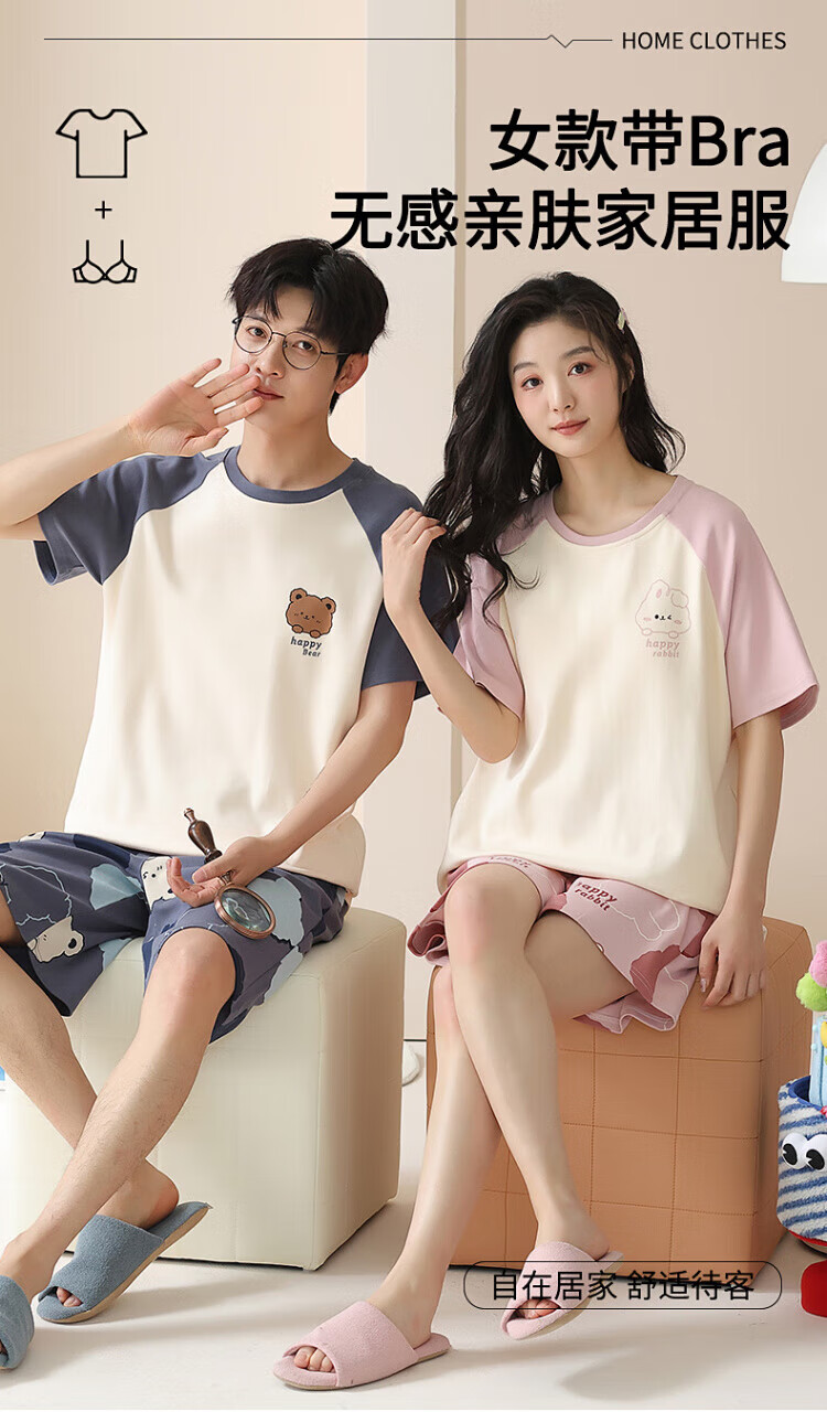 Yalu with chest pad couple pajamas summer pure cotton short-sleeved women's sweet cartoon men's thin can be worn outside home clothes set 691 M women get men L
