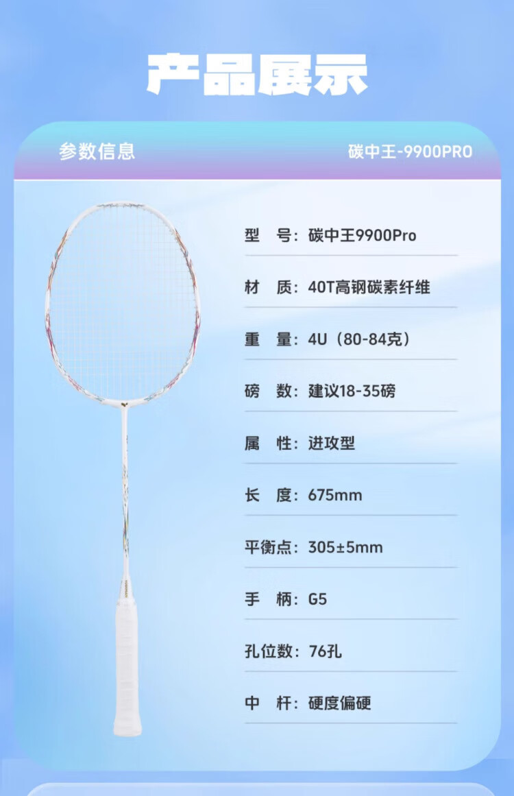 尤迪曼(yodiman)碳中王羽毛球拍单拍全碳素纤维超轻进攻型比赛级款高磅 4U 碳中王9900Pro流光白进攻型送 22磅(小孩适用)
