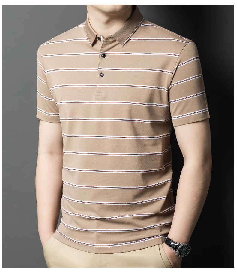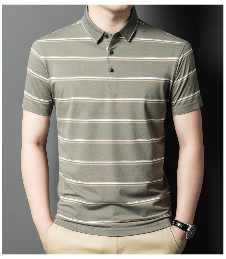 GY桑蚕丝短袖T恤男夏季新款条纹翻领中年爸爸装polo衫 826绿色 L 170[建议125-140斤]