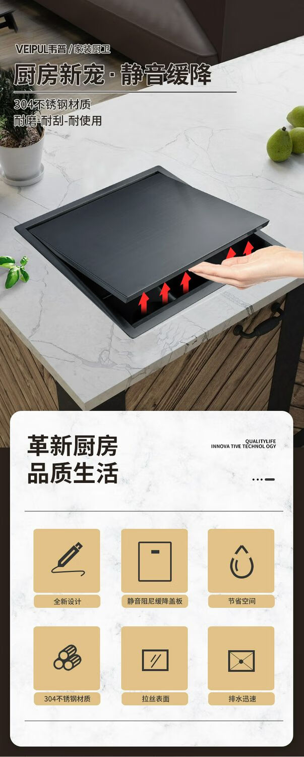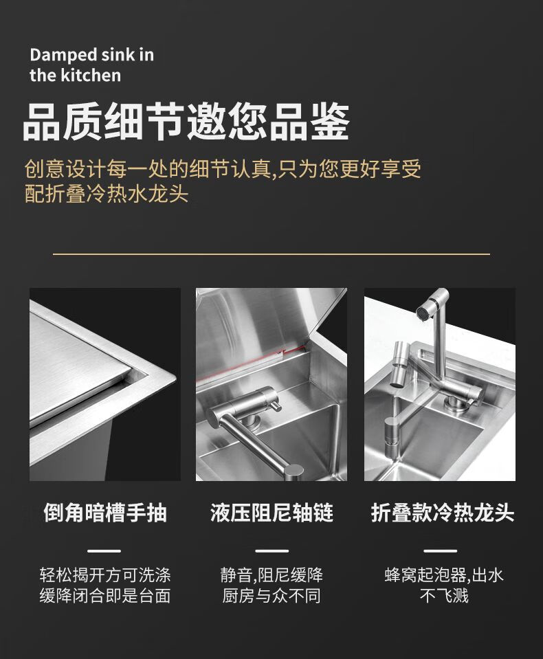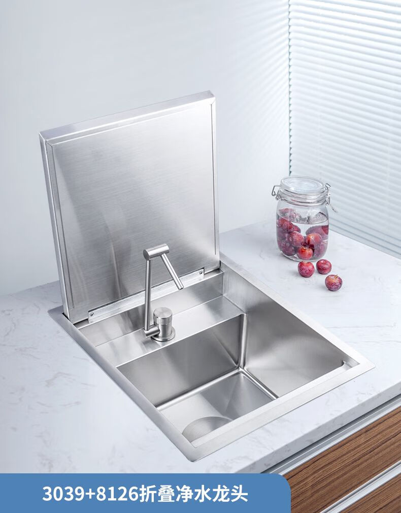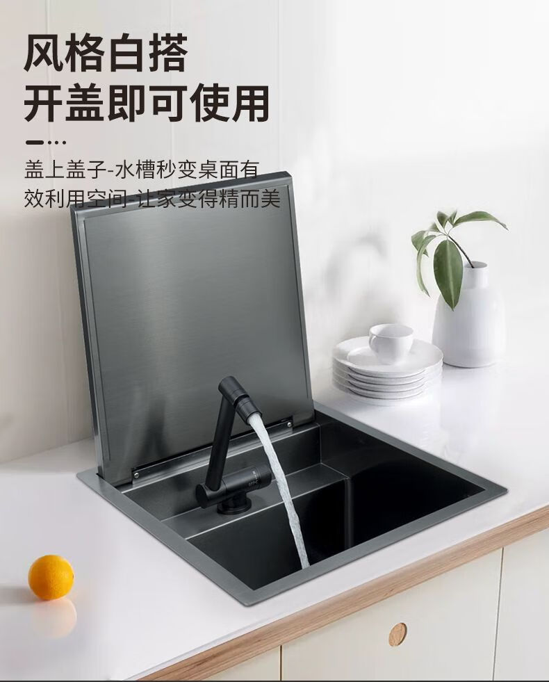 Fregadero pequeño invisible con barra de acero inoxidable 304, isla de una sola ranura con cubierta amortiguadora para ocultar el mini fregadero 4839, lavadora con tapa abatible, tipo amortiguación + elevación y enfriamiento