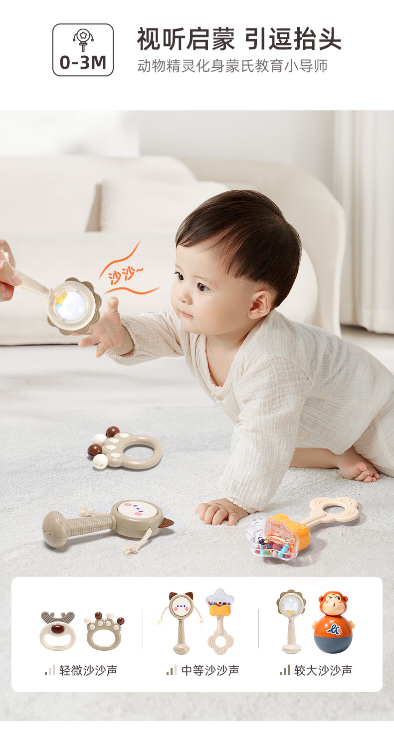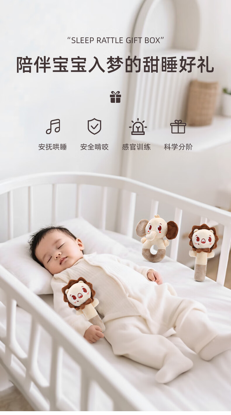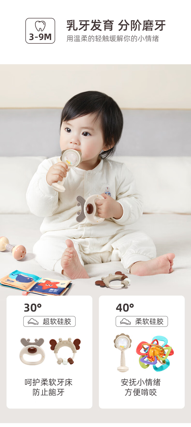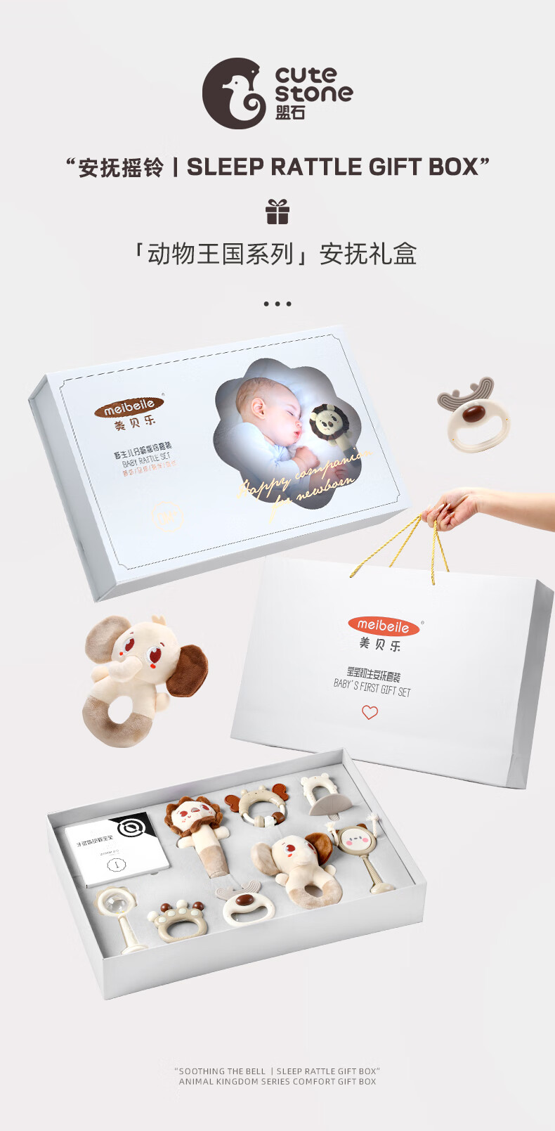 Cute Stone Babyspielzeug, 0–1 Jahre alt, Handrassel, Neugeborenenbiss, beruhigend, hochwertige Geschenkbox, Einjähriges Geschenk, Vollmond, 0–6 Monate, Rassel, 10-teiliges Set, Geschenkbox + visuelle Stimulationskarte, gemeinsam hergestellt von Maybelle und Cute Stone