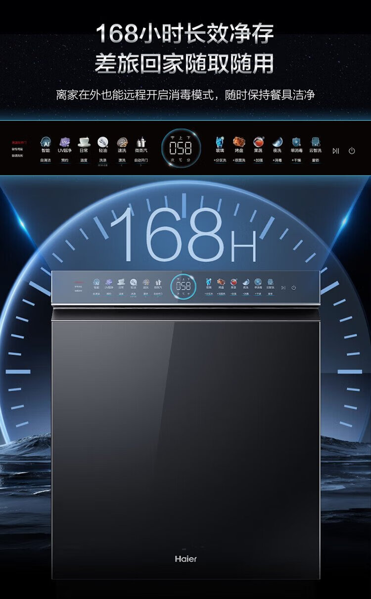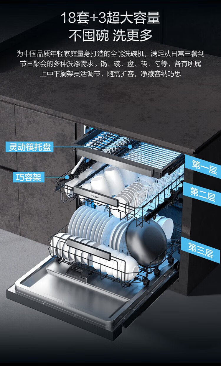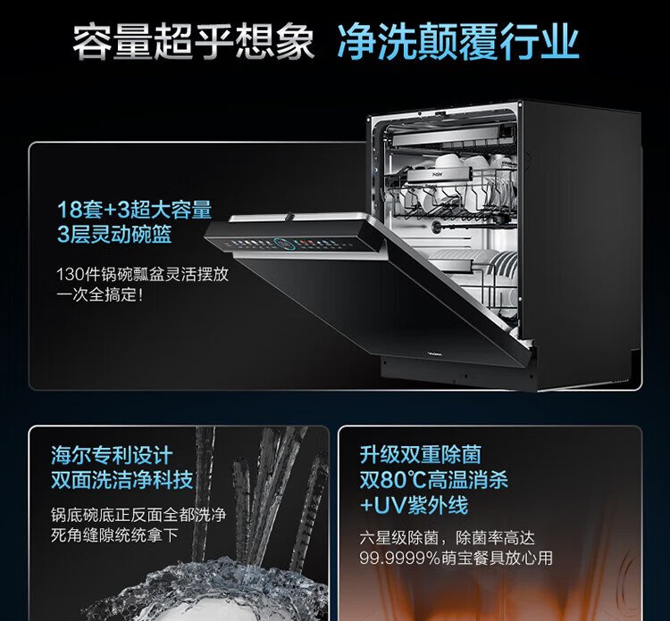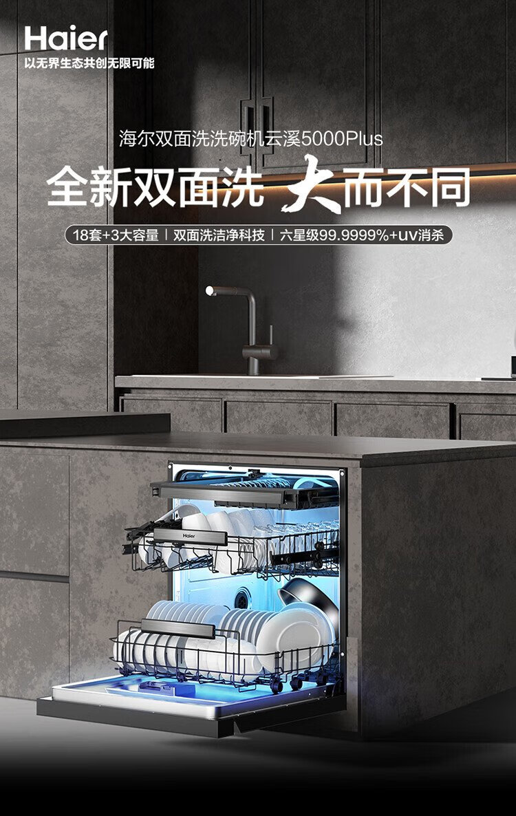 Haier W5000Plus double-sided washing household built-in fully automatic dishwasher upgrade 18 sets + 3 large-capacity UV double sterilization 7-day long-term storage smart door opening quick drying AI intelligent double-sided washing EYBW18566JHU1 empty black
