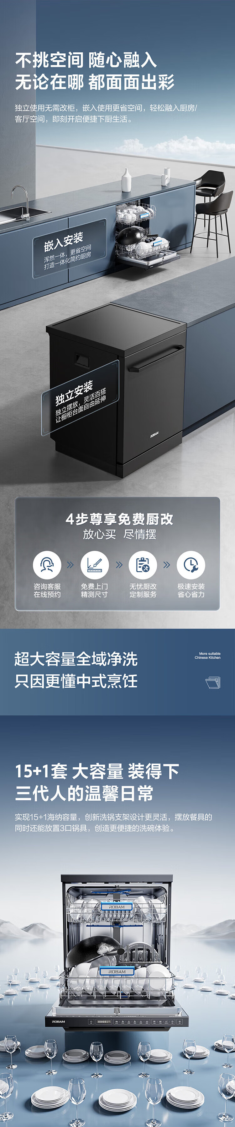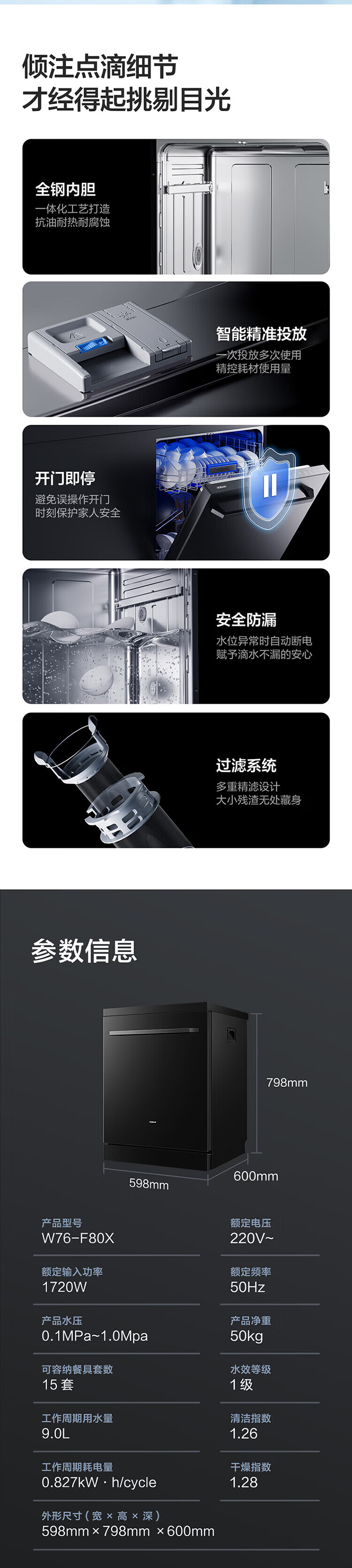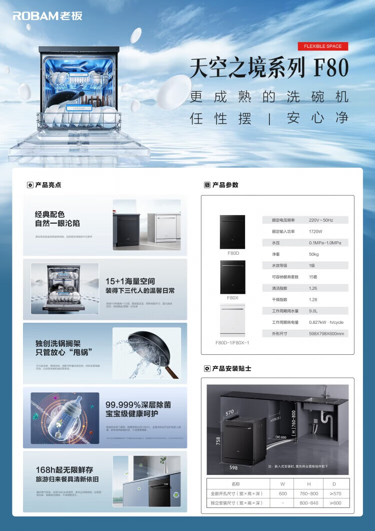 Robam dishwasher F80D built-in 15 sets large capacity New high-energy bubble washing Fully automatic hot air drying High-temperature sterilization cleaning Built-in dishwasher first-class water efficiency Mysterious black in the sky Innovative full-dimensional actuarial cleaning technology