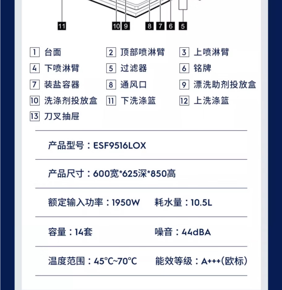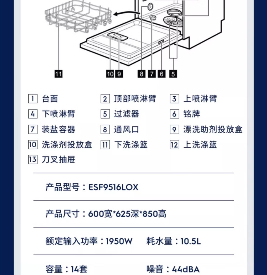 Electrolux dishwasher 14 sets of large-capacity household independent embedded frequency conversion sterilizing dishwashers imported from Europe ESF9516LOX