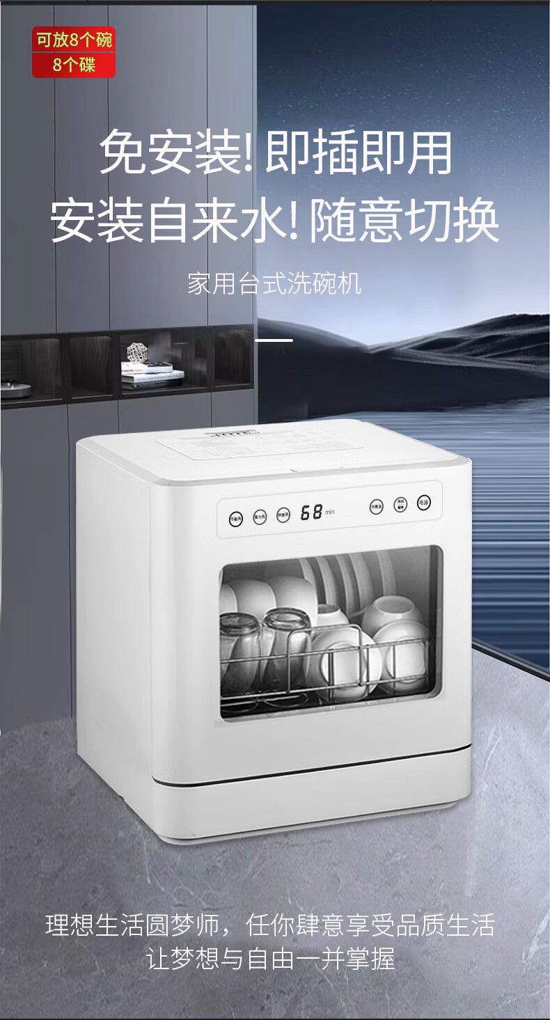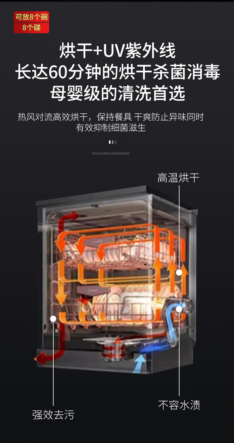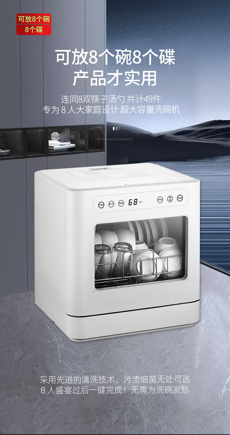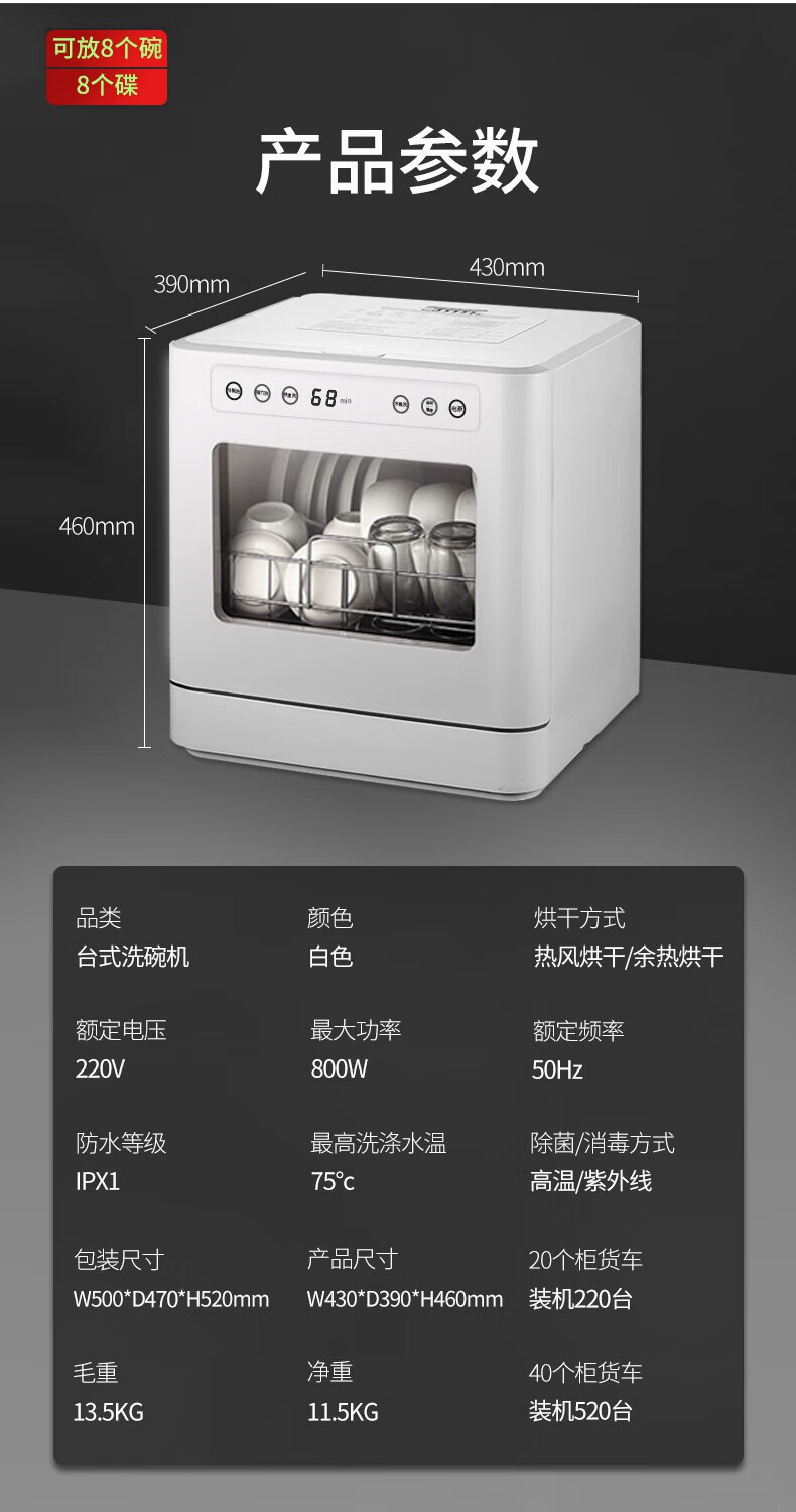 Little Sun 8-person dishwasher, large capacity, household desktop, smart, small, fully automatic drying, multi-function, installation-free, bench-mounted dual-purpose, dual-mode model - tap water/self-absorbing water, length, width and height 43*39*46 cm